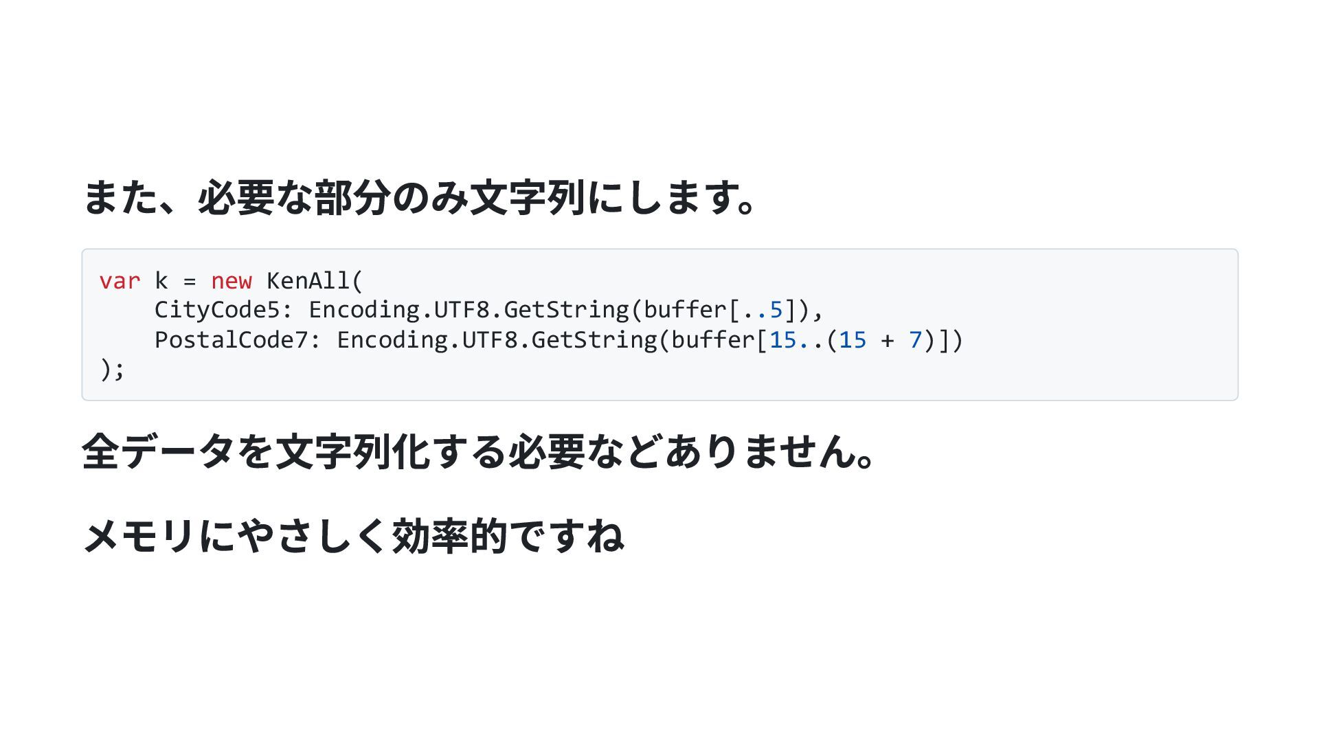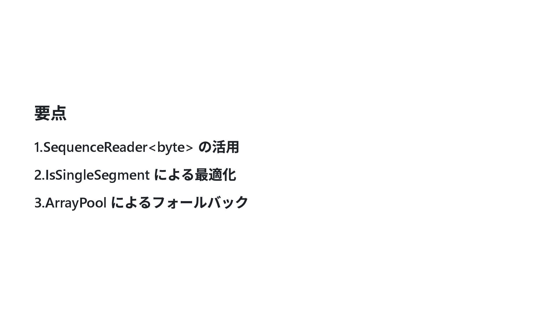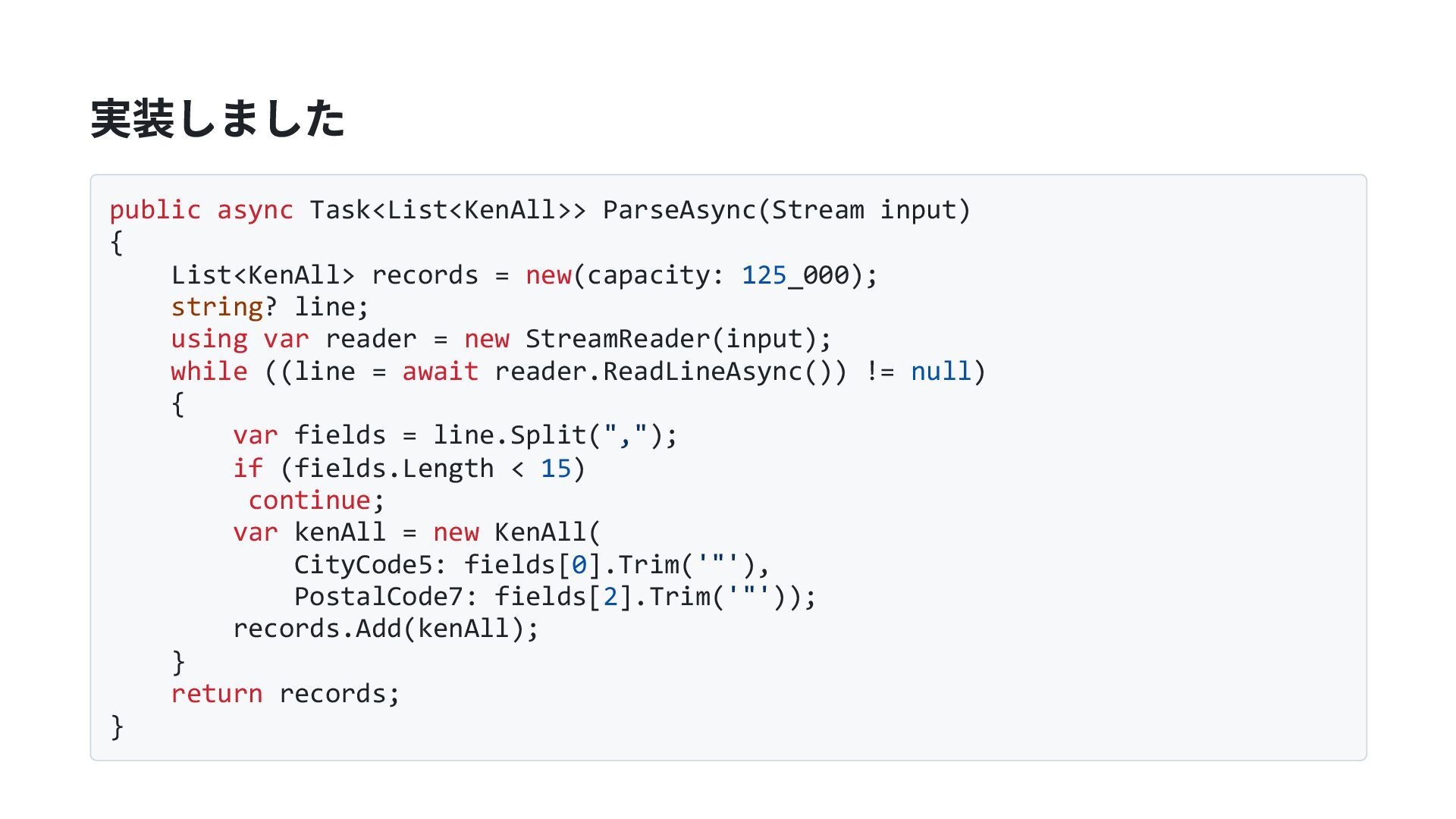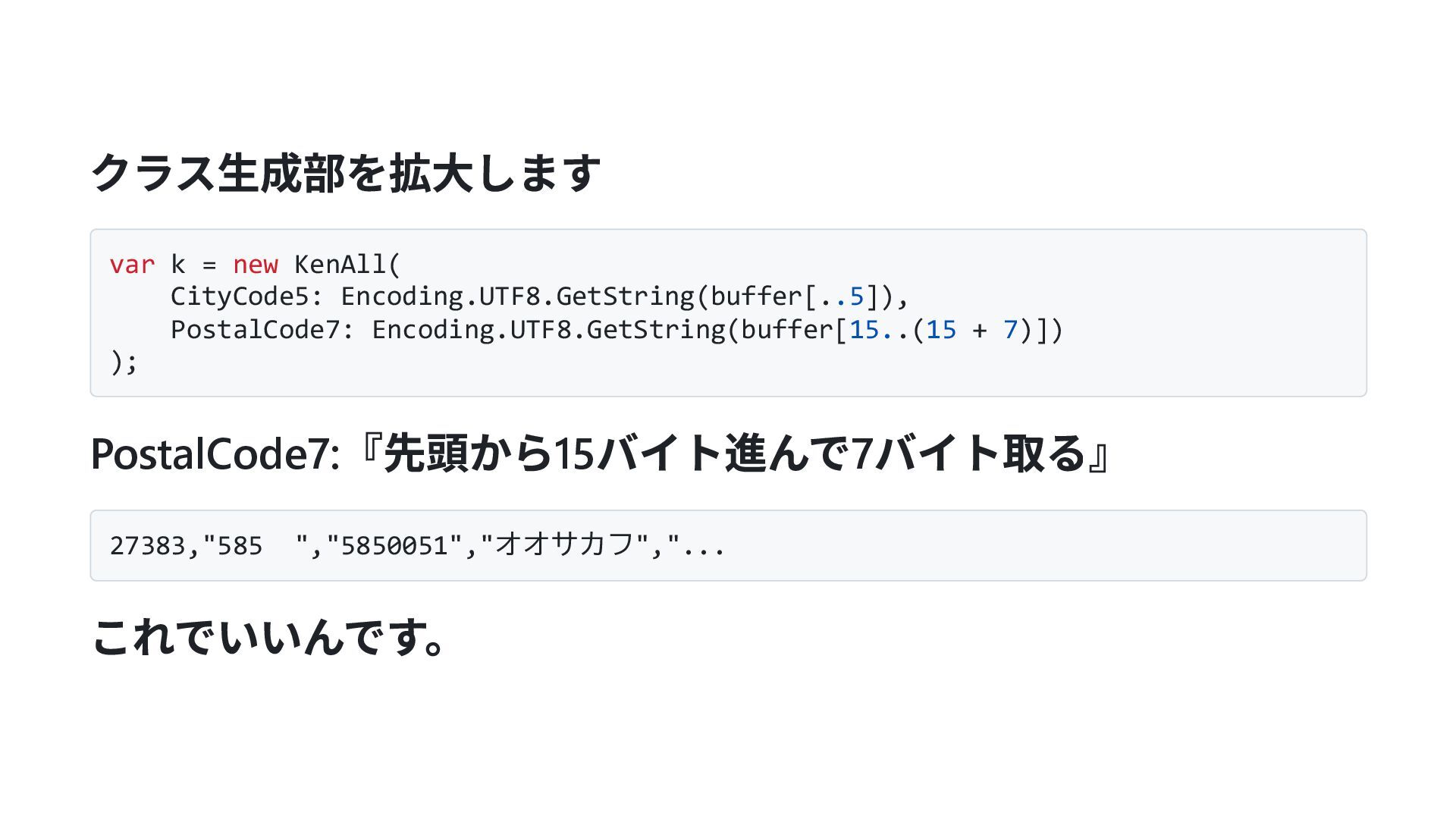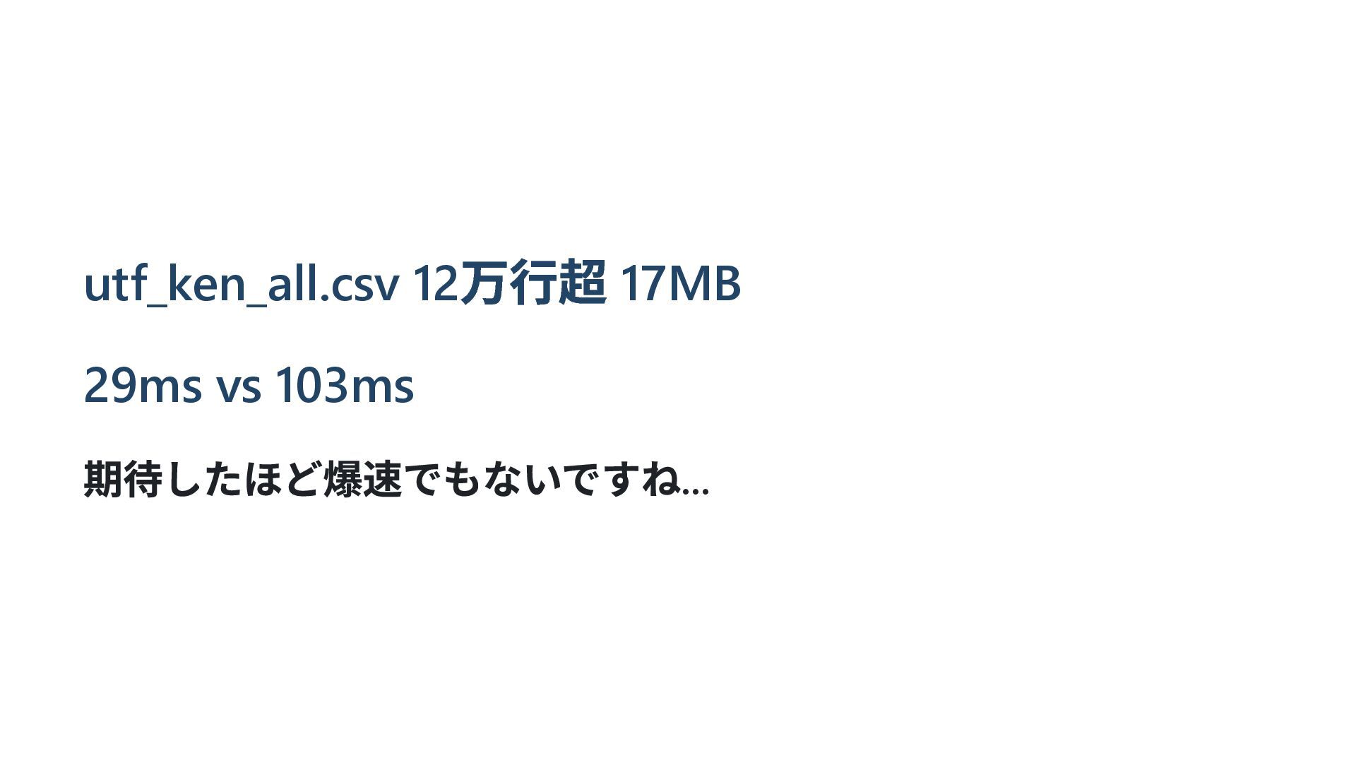.NETの System.IO.Pipelines を使って、12万行超の郵便番号CSVを爆速で読み込む実験記録です。 「CSVを固定長として扱う」アプローチにより、StreamReader と比較して速度3.5倍、メモリ割り当て1/9を実現しました。 BenchmarkDotNetによる .NET 8 と .NET 10 の比較計測結果や、SequenceReader を使った具体的な実装テクニックも公開しています。