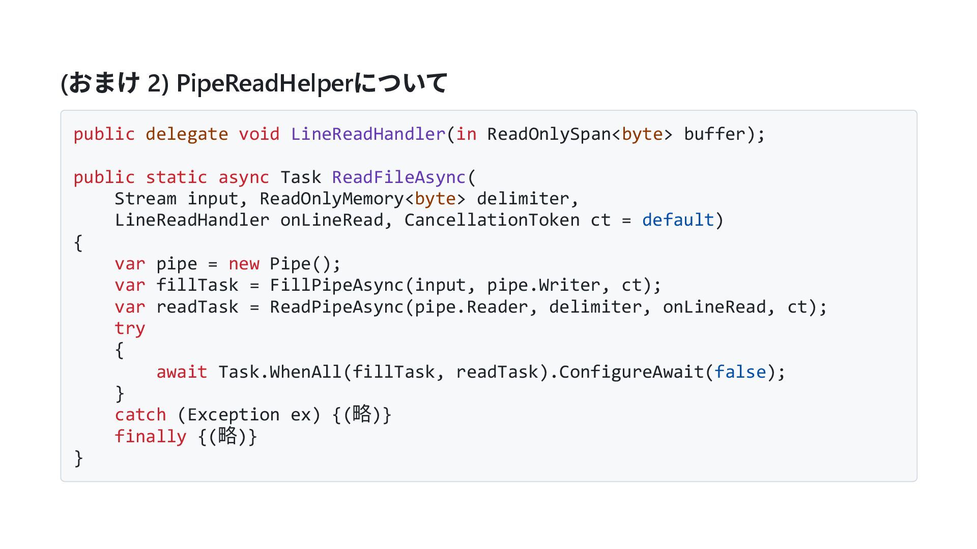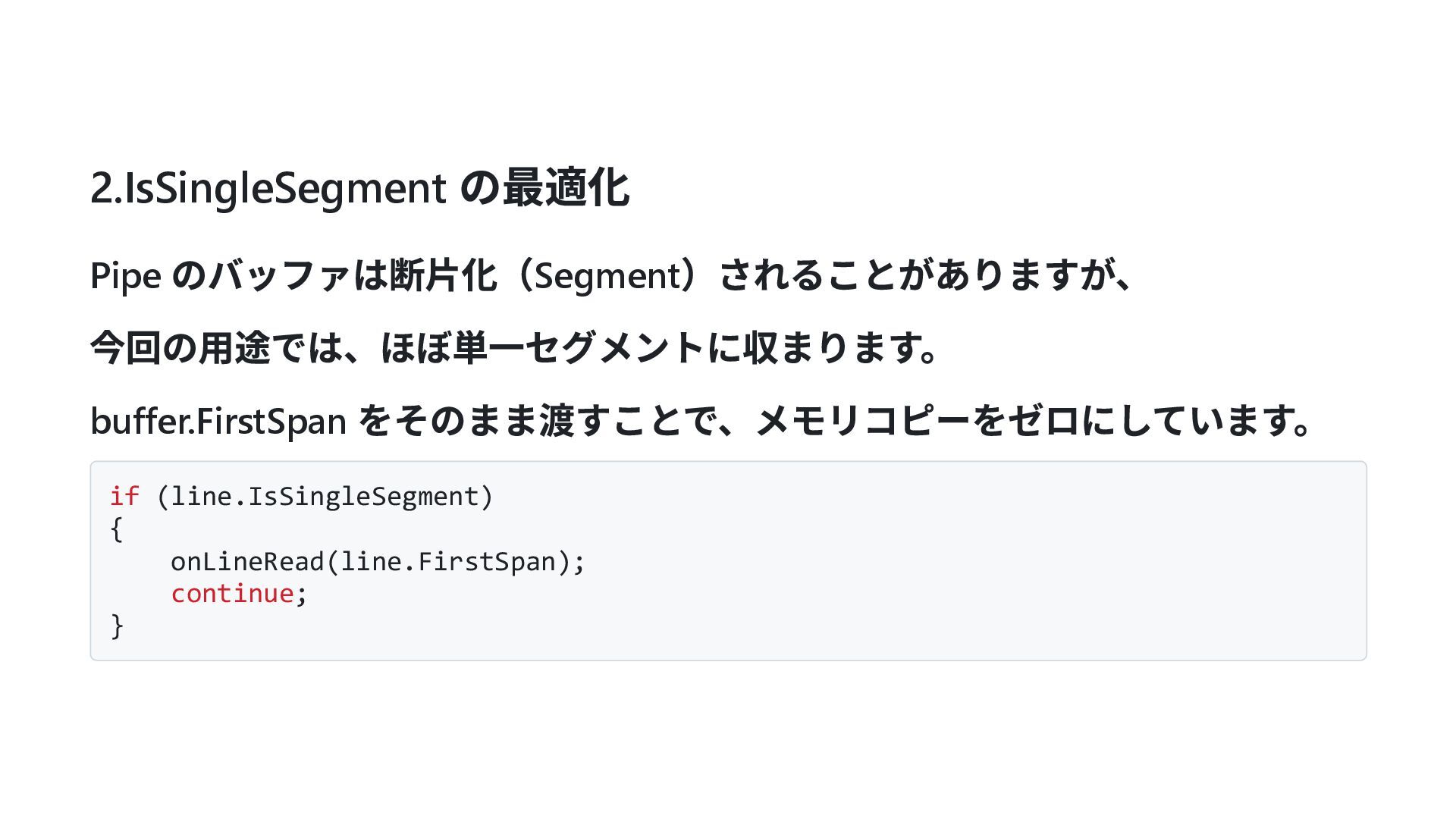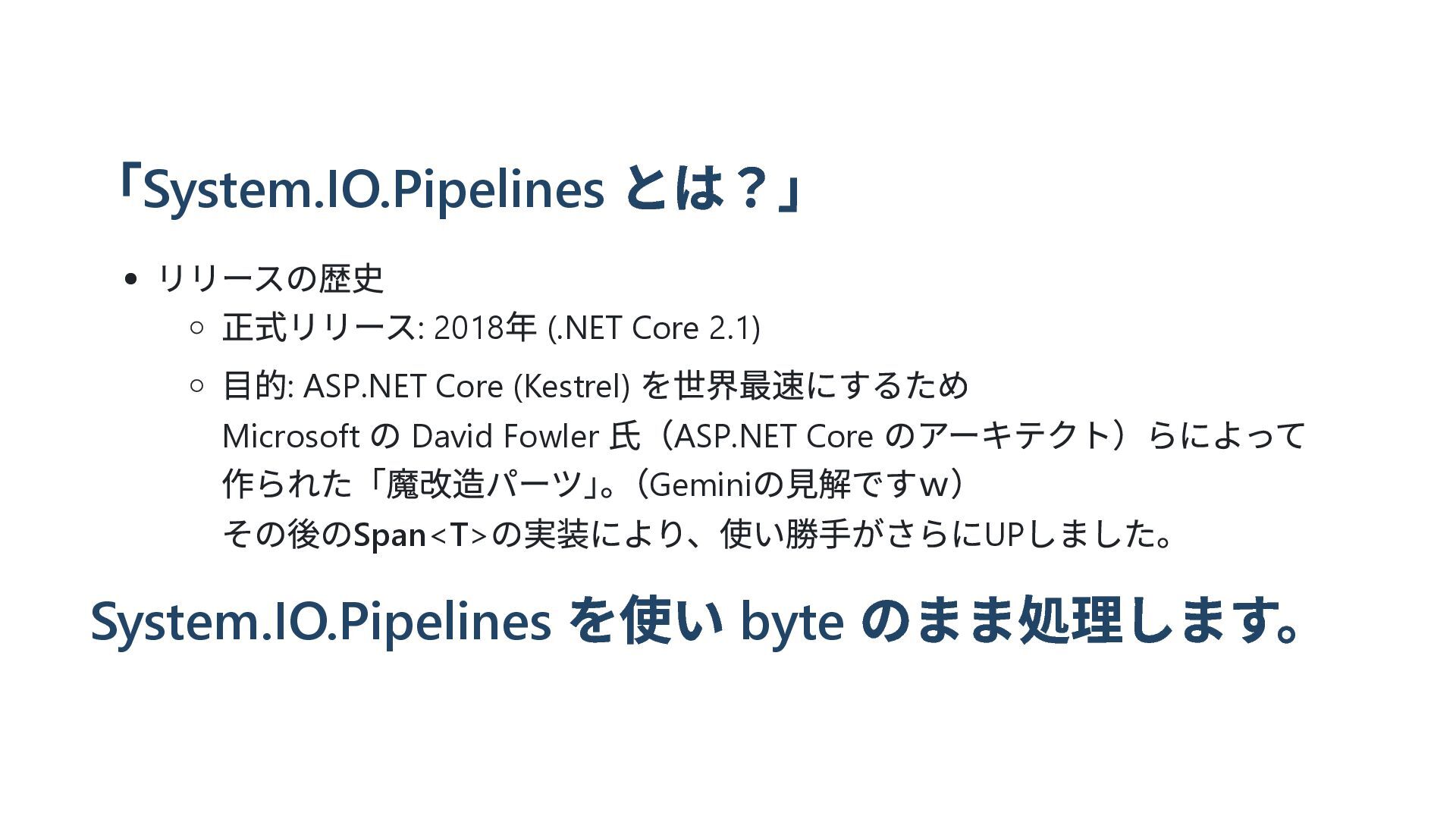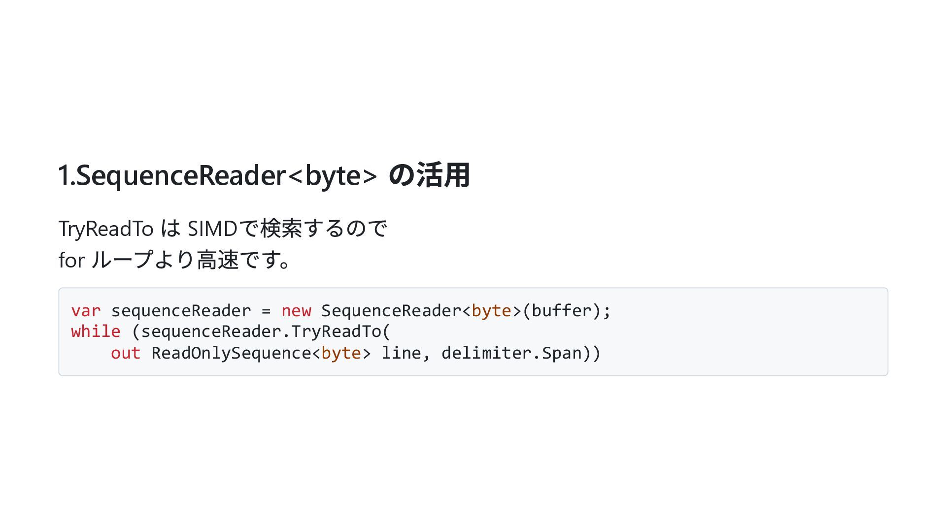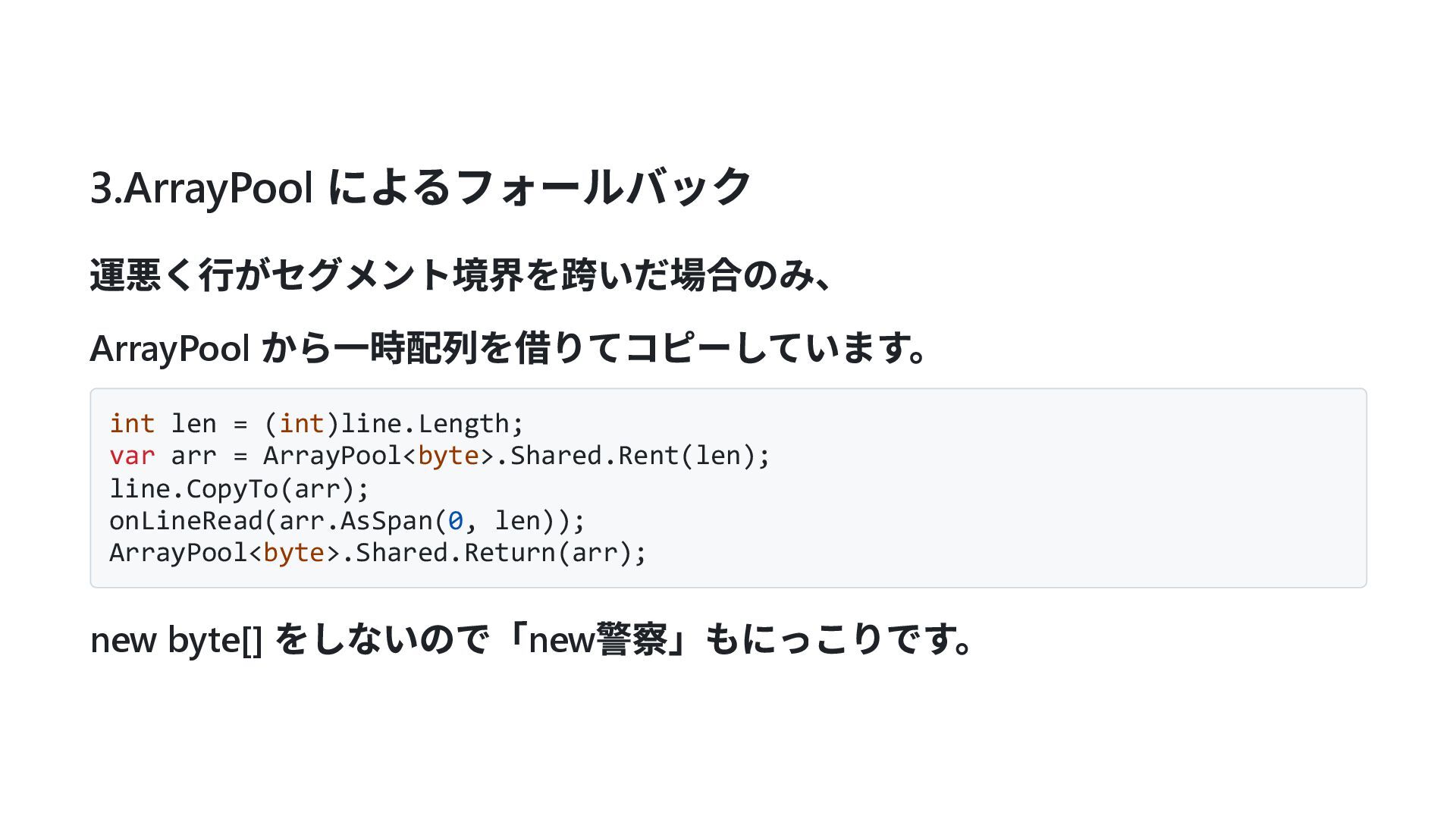 .NETの System.IO.Pipelines を使って、12万行超の郵便番号CSVを爆速で読み込む実験記録です。 「CSVを固定長として扱う」アプローチにより、StreamReader と比較して速度3.5倍、メモリ割り当て1/9を実現しました。 BenchmarkDotNetによる .NET 8 と .NET 10 の比較計測結果や、SequenceReader を使った具体的な実装テクニックも公開しています。