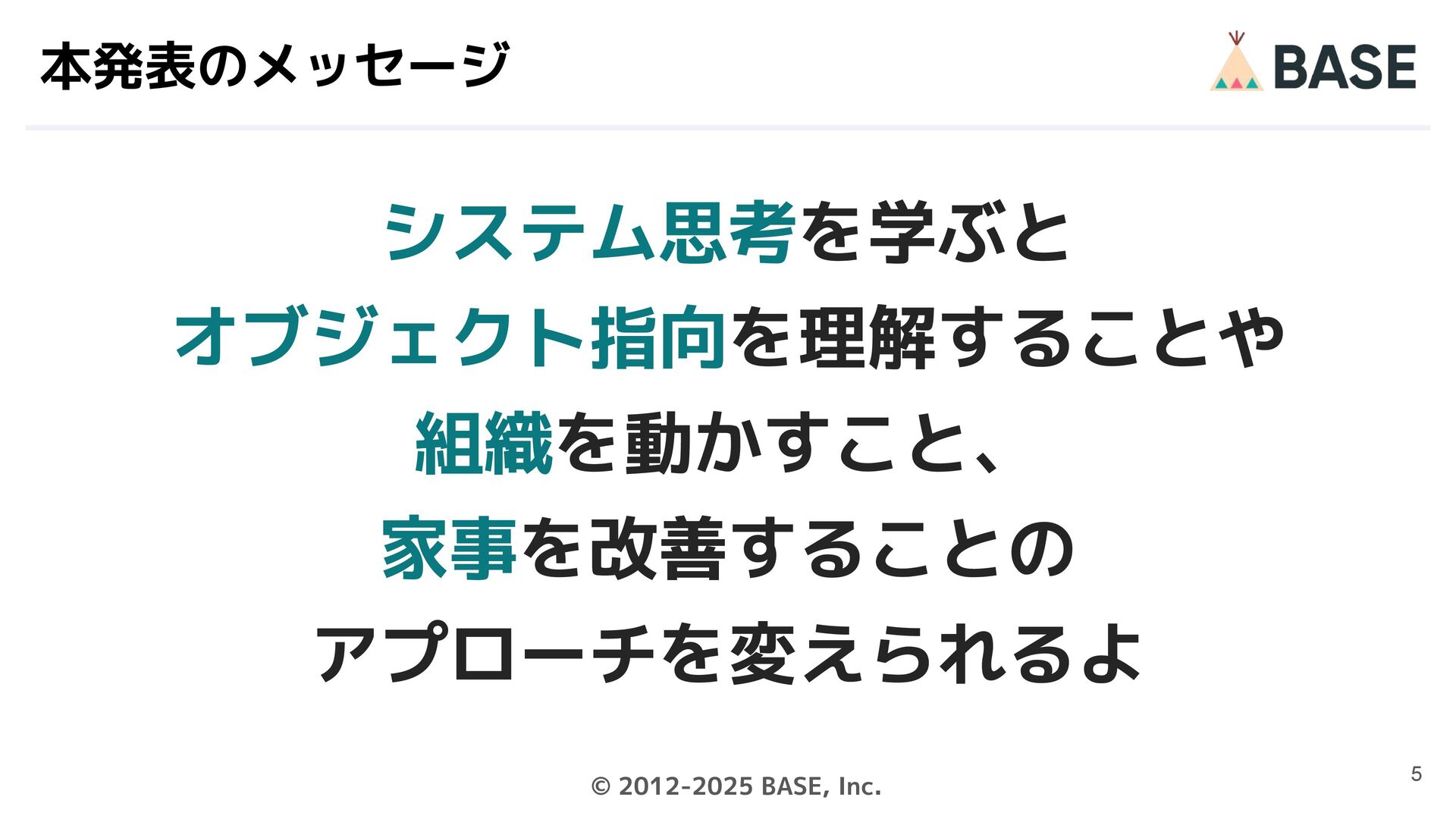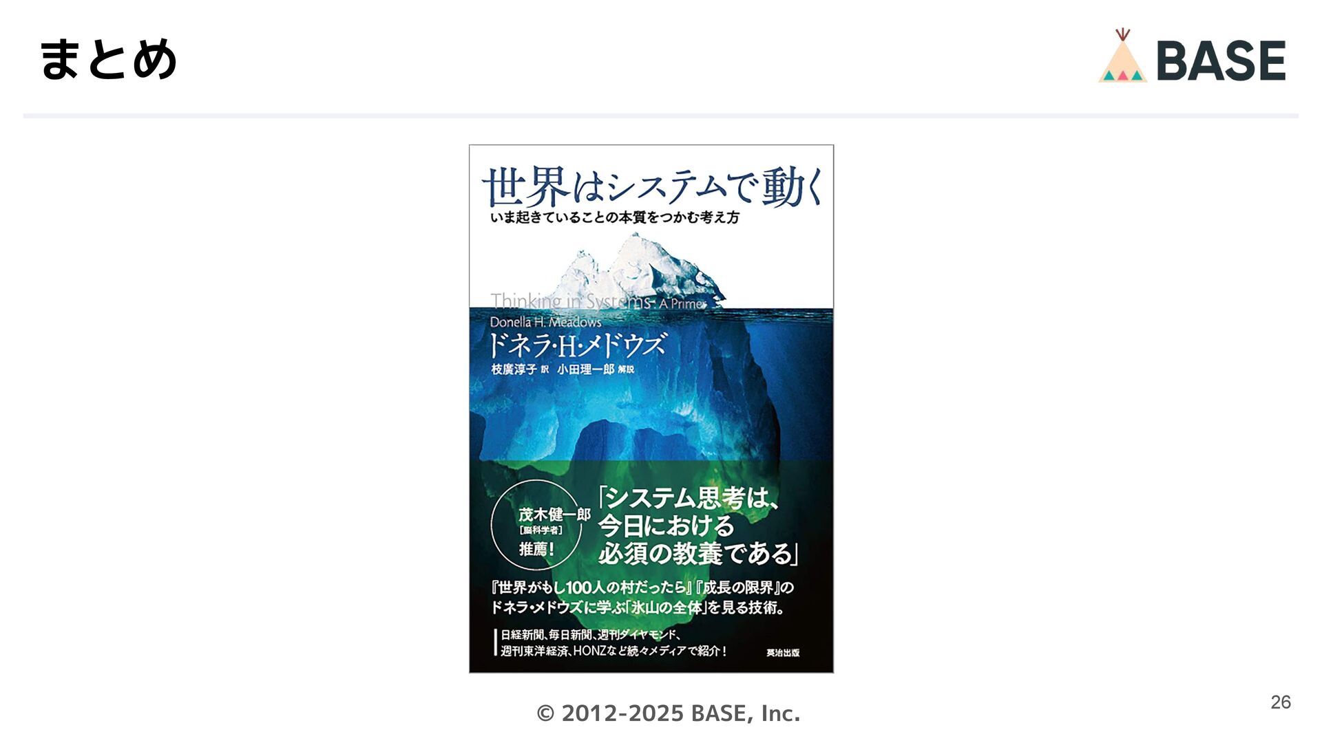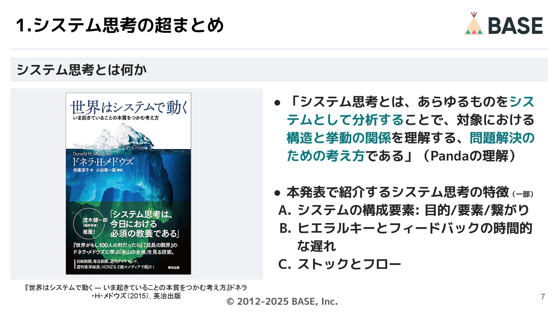 2. © 2012-2025 BASE, Inc. 1.システム思考の超まとめ • 「システム思考とは、あらゆるものをシス テムとして分析することで、対象における 構造と挙動の関係を理解する、問題解決の ための考え方である」(Pandaの理解)