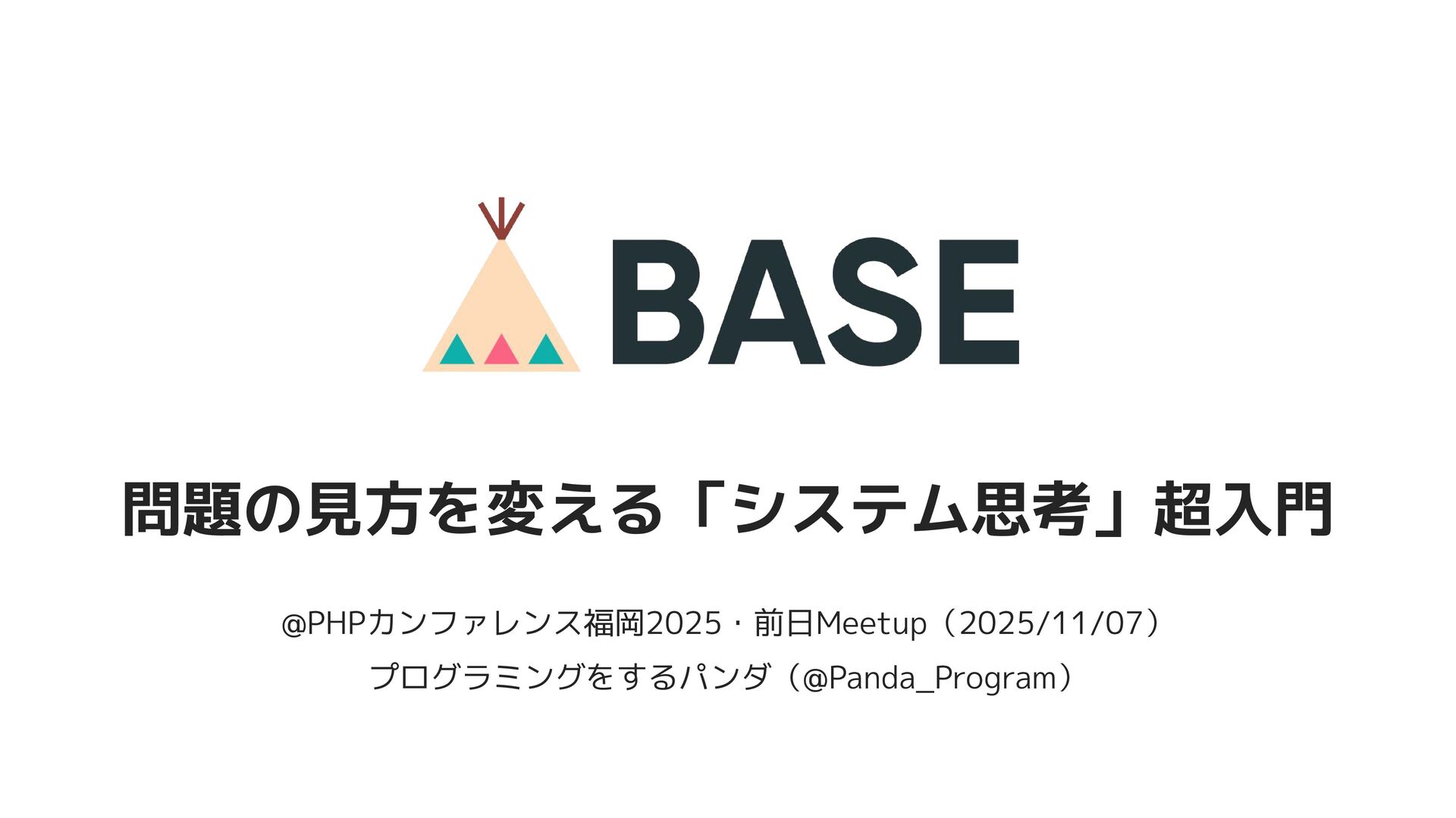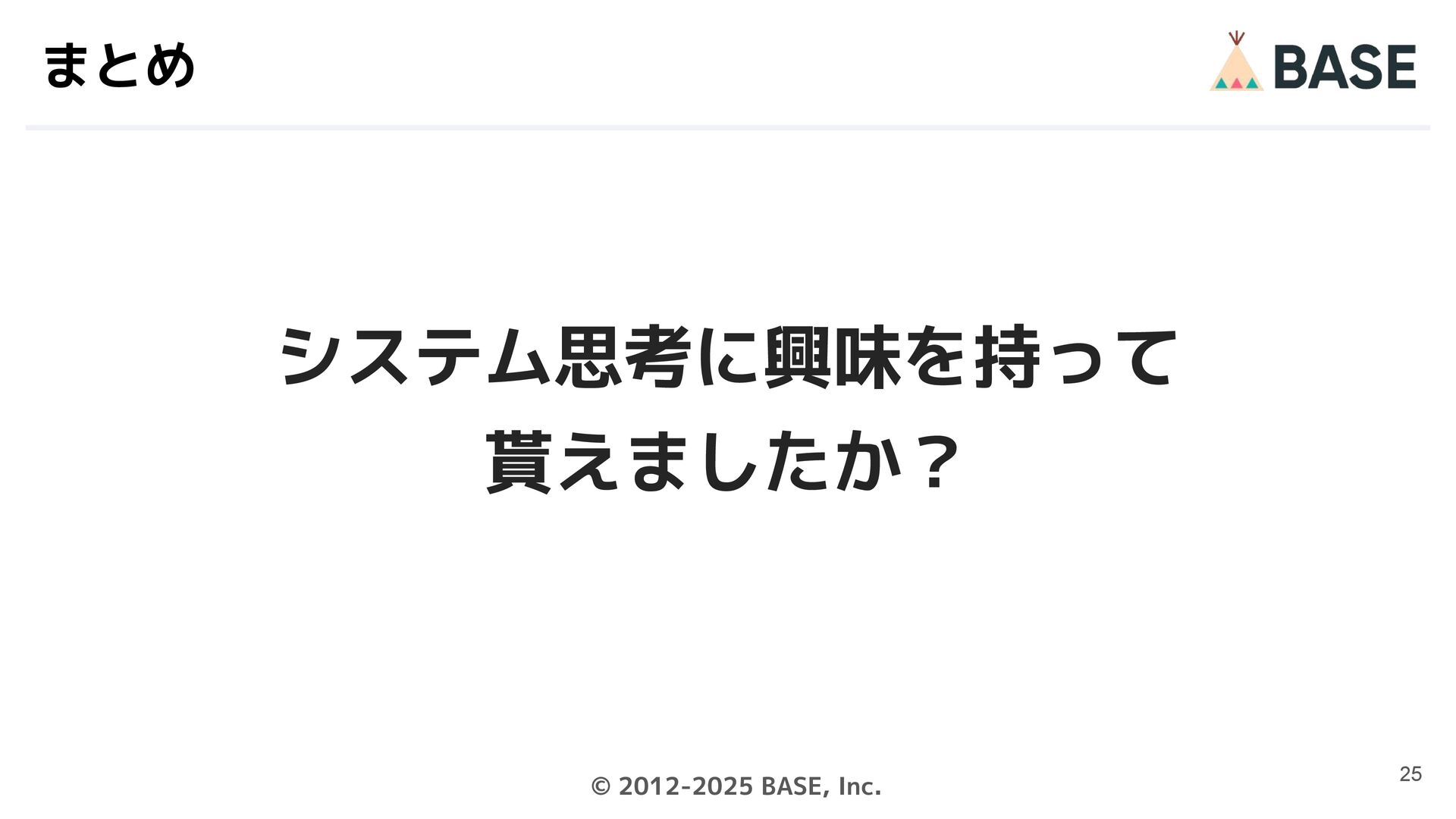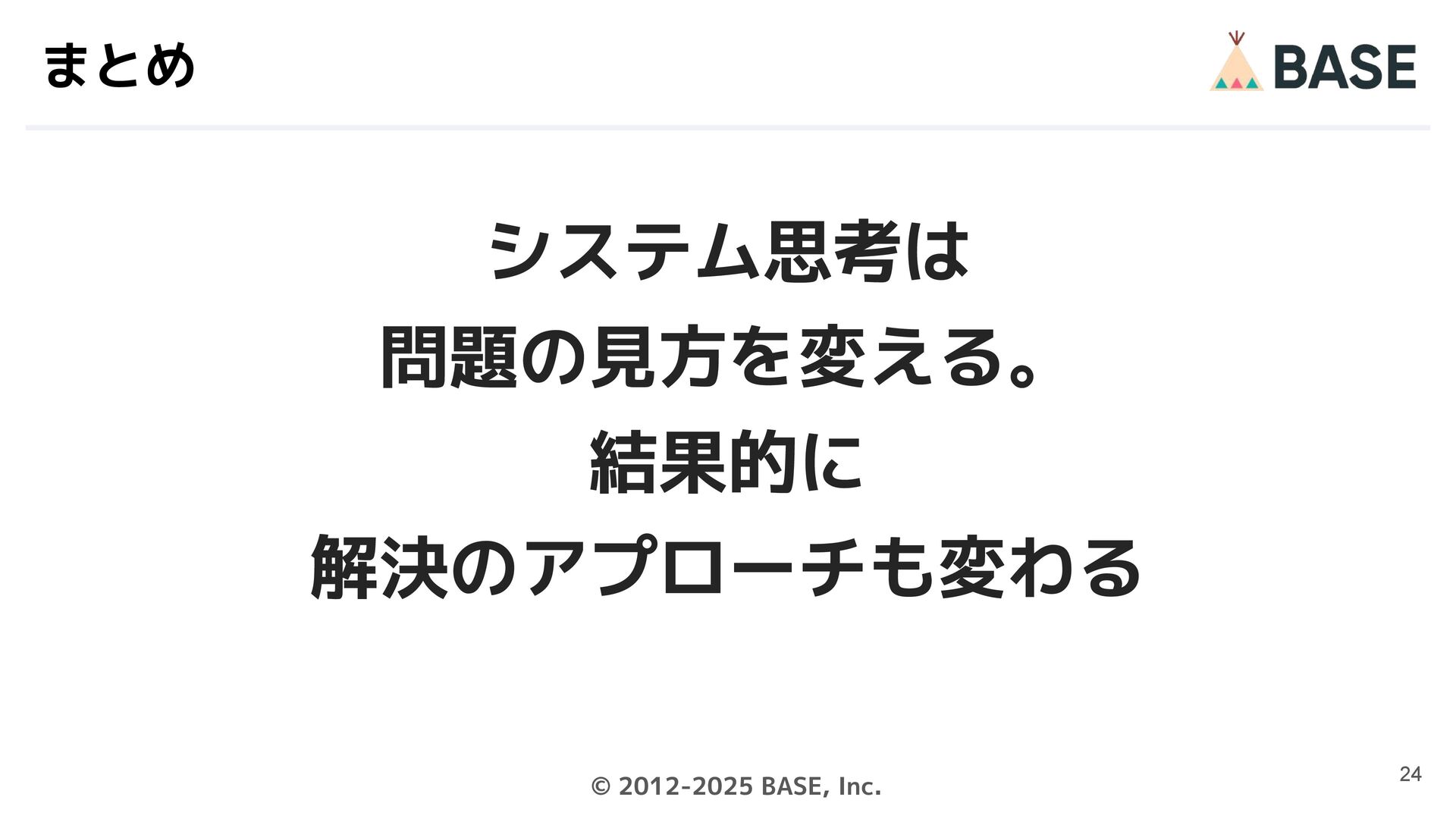2. © 2012-2025 BASE, Inc. 1.システム思考の超まとめ • 「システム思考とは、あらゆるものをシス テムとして分析することで、対象における 構造と挙動の関係を理解する、問題解決の ための考え方である」(Pandaの理解)