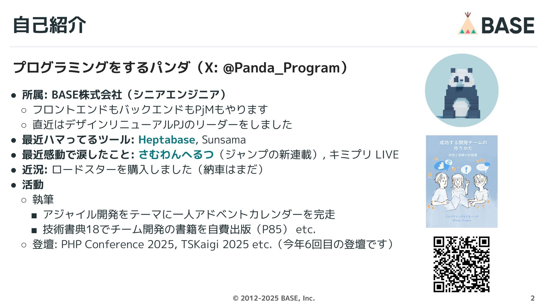 フロントエンドもバックエンドもPjMもやります ◦ 直近はデザインリニューアルPJのリーダーをしました • 最近ハマってるツール: Heptabase, Sunsama • 最近感動で涙したこと: さむわんへるつ(ジャンプの新連載), キミプリ LIVE • 近況: ロードスターを購入しました(納車はまだ) • 活動 ◦ 執筆 ▪ アジャイル開発をテーマに一人アドベントカレンダーを完走 ▪ 技術書典18でチーム開発の書籍を自費出版(P85) etc. ◦ 登壇: PHP Conference 2025, TSKaigi 2025 etc.(今年6回目の登壇です) プログラミングをするパンダ(X: @Panda_Program)