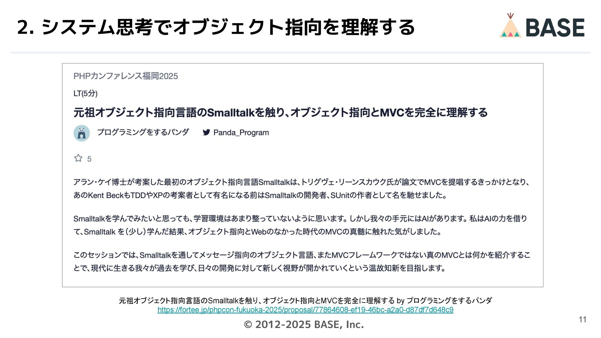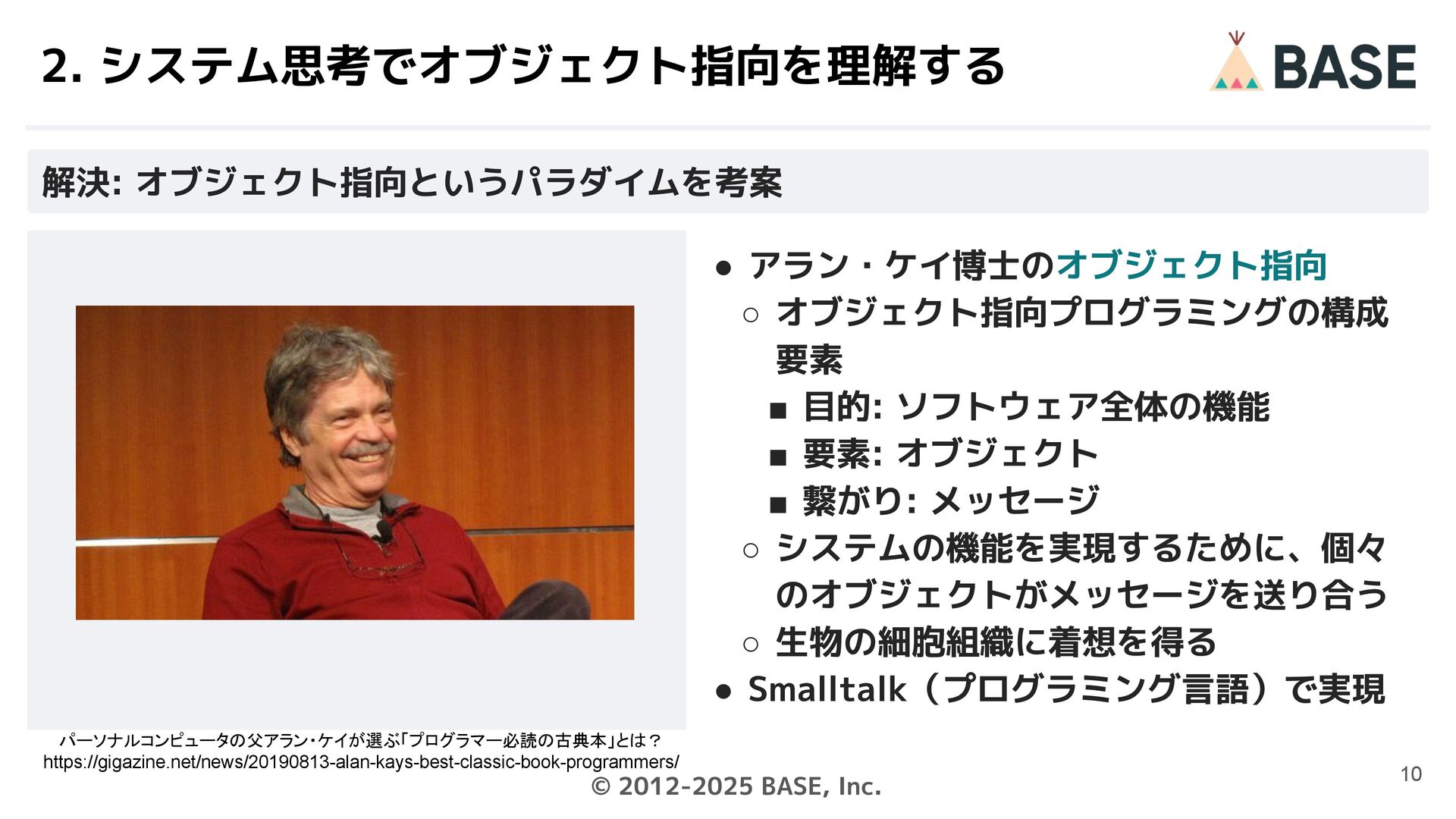 4. © 2012-2025 BASE, Inc. 2. システム思考でオブジェクト指向を理解する • アラン・ケイ博士のオブジェクト指向 ◦ オブジェクト指向プログラミングの構成