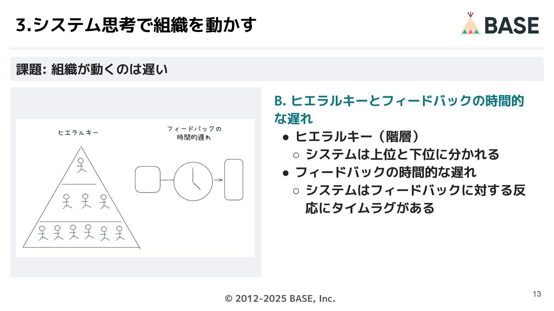 5. © 2012-2025 BASE, Inc. 3.システム思考で組織を動かす B. ヒエラルキーとフィードバックの時間的 な遅れ • ヒエラルキー(階層)