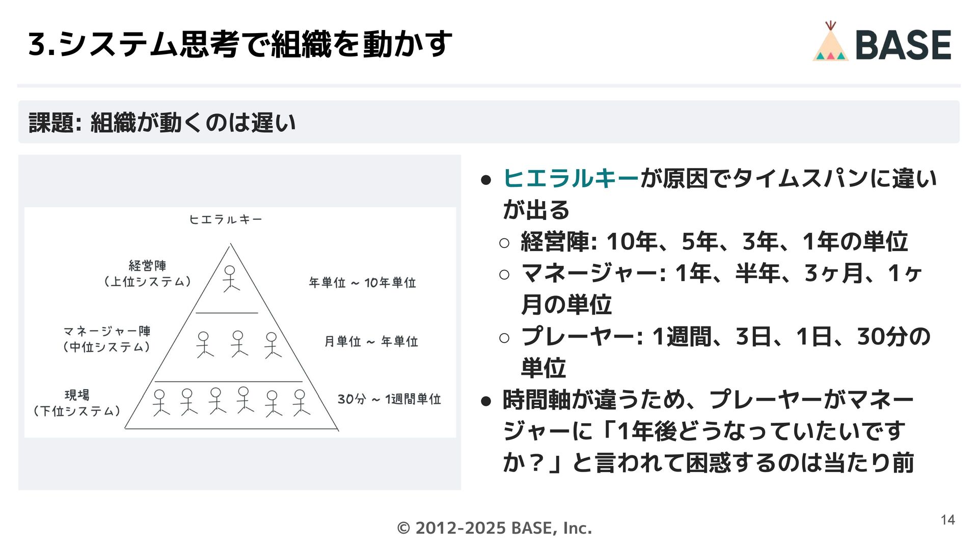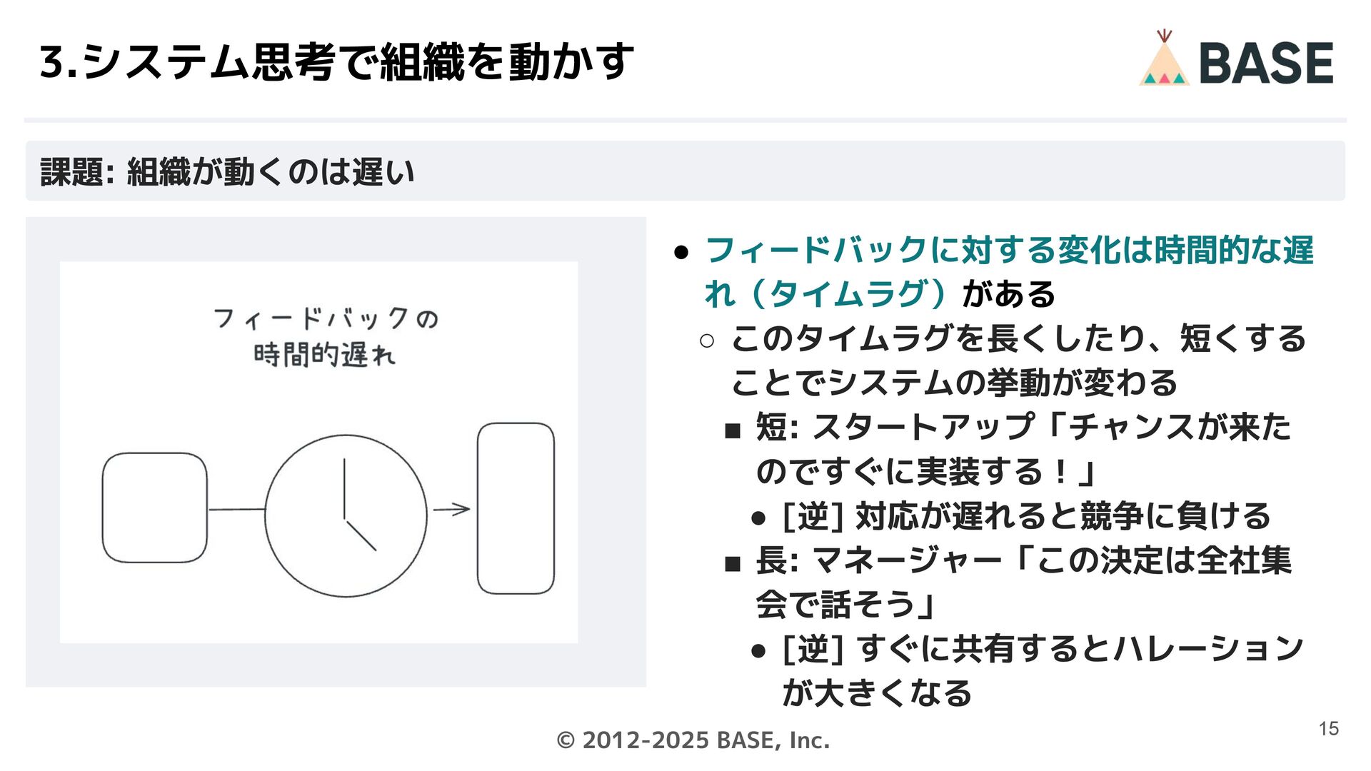 6. © 2012-2025 BASE, Inc. 3.システム思考で組織を動かす 課題: 組織が動くのは遅い 14 14 •