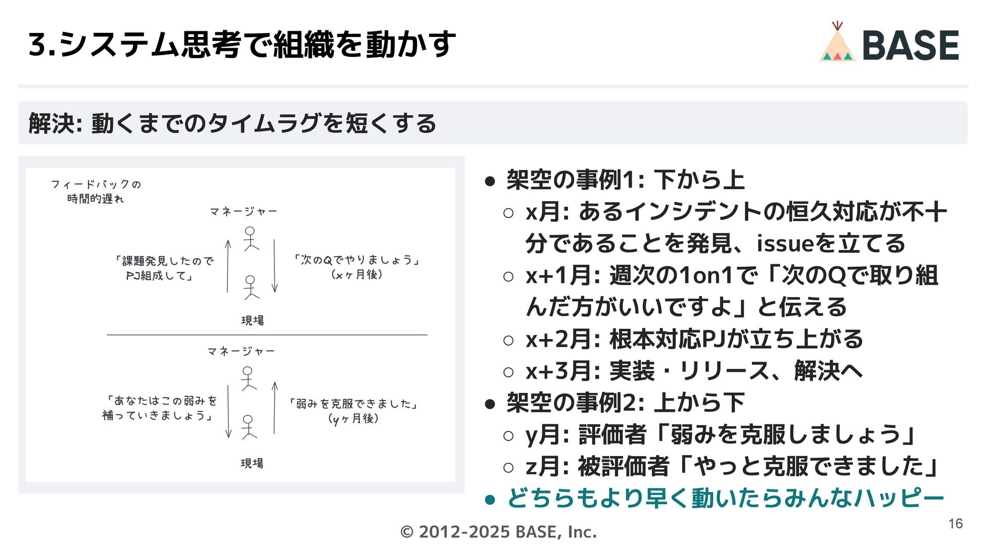 8. © 2012-2025 BASE, Inc. 3.システム思考で組織を動かす 解決: 動くまでのタイムラグを短くする 16 16 •