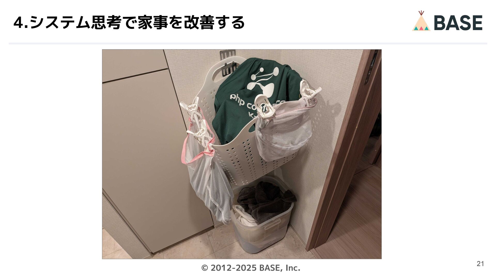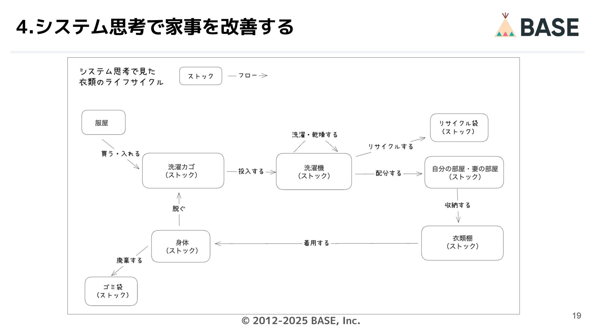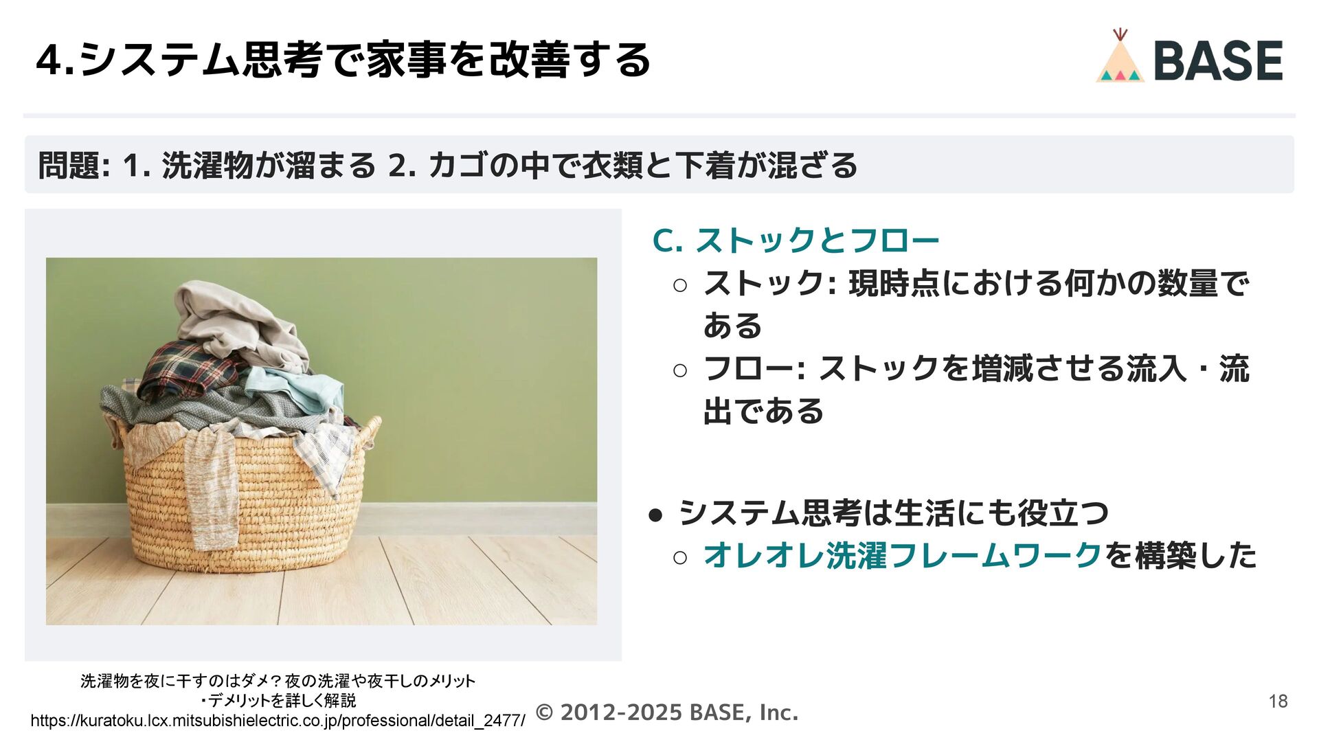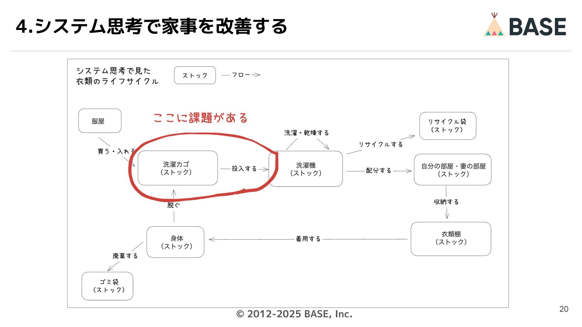 9. © 2012-2025 BASE, Inc. 4.システム思考で家事を改善する 問題: 1. 洗濯物が溜まる 2. カゴの中で衣類と下着が混ざる