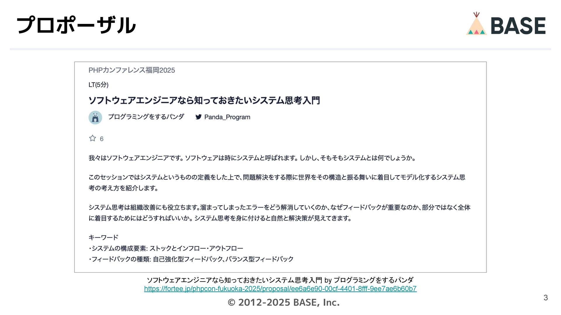 1. 2 © 2012-2025 BASE, Inc. 自己紹介 • 所属: BASE株式会社(シニアエンジニア) ◦