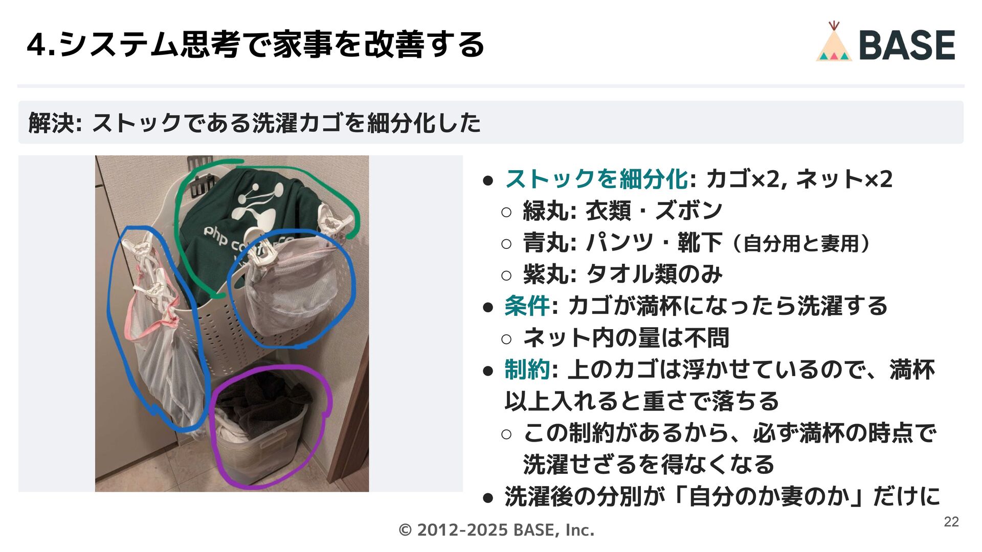 10. © 2012-2025 BASE, Inc. 4.システム思考で家事を改善する 解決: ストックである洗濯カゴを細分化した 22 22 •