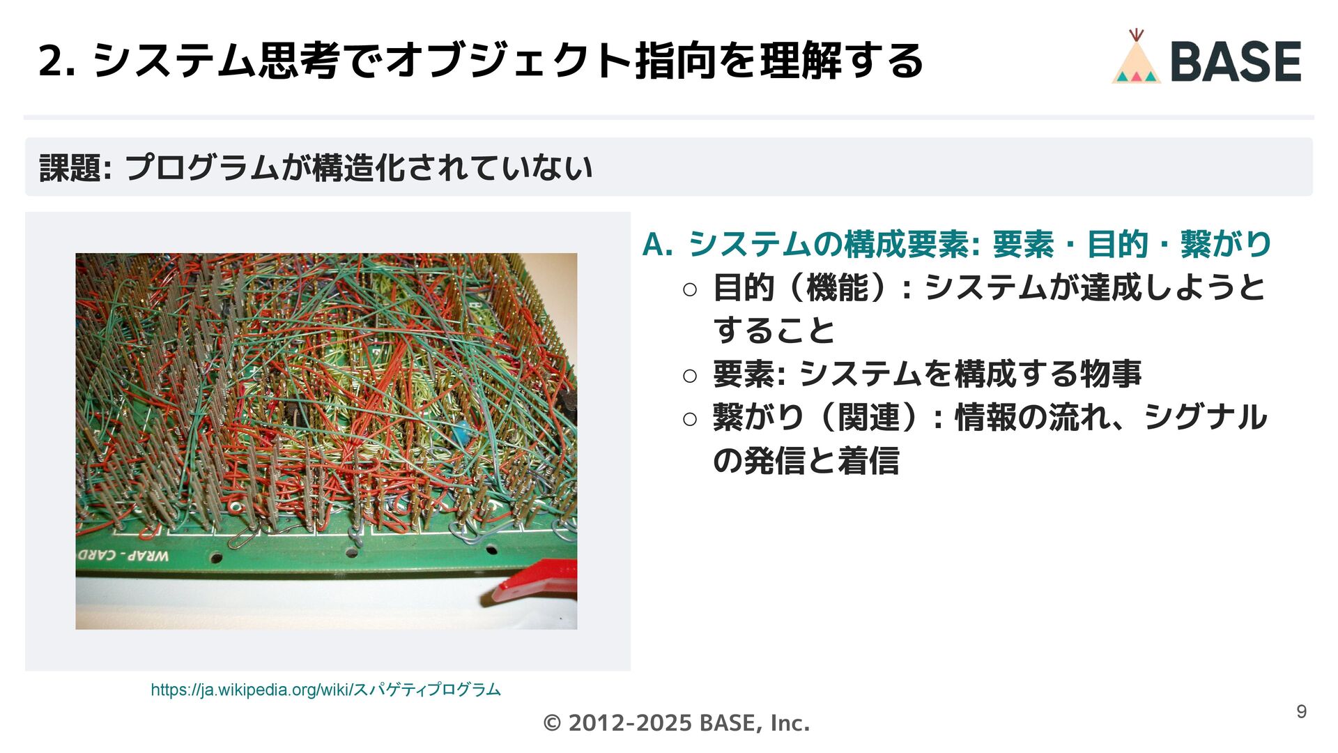 3. © 2012-2025 BASE, Inc. 2. システム思考でオブジェクト指向を理解する A. システムの構成要素: 要素・目的・繋がり ◦