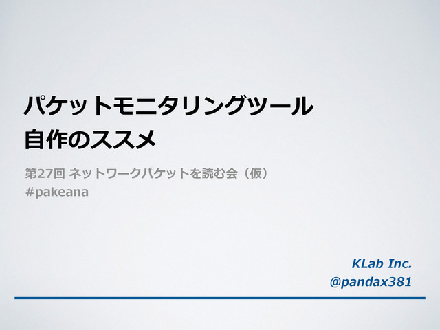 char expression[] = “tcp”; struct bpf_̲program bpf; ! pcap = pcap_̲create(“en0”, errmsg); pcap_̲set_̲promisc(pcap, 1); pcap_̲activate(pcap); pcap_̲compile(pcap, &bpf, expression, 0, 0); pcap_̲setfilter(pcap, &bpf); pcap_̲freecode(&bpf); ! pcap_̲loop(pcap, -‐‑‒1, callback, NULL); ! pcap_̲close(pcap); ! ! ! // フィルタ構⽂文 ! ! // 新しいpcapハンドルを作成 ! ! // フィルタ構⽂文をコンパイル // コンパイル済みのフィルタをハンドルに適⽤用 ! ! // コールバック関数を登録してキャプチャ開始