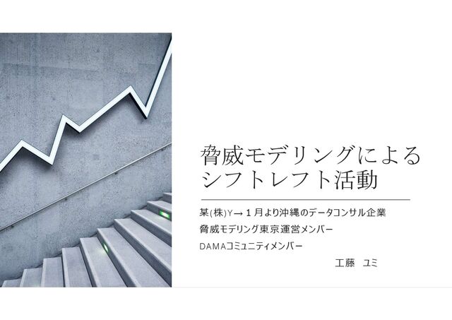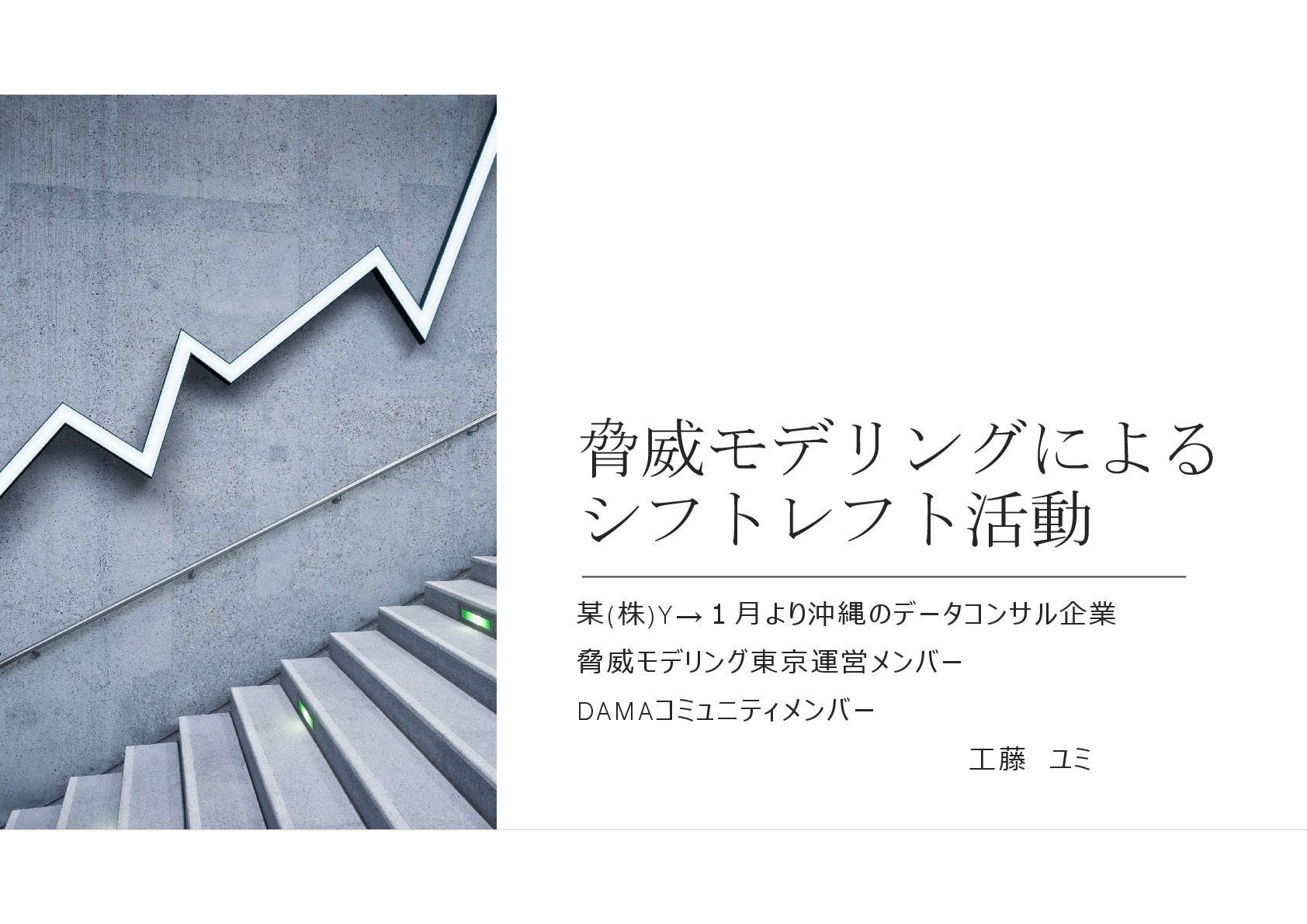脅威モデリングによる シフトレフト活動 某(株)Y→1月より沖縄のデータコンサル企業 脅威モデリング東京運営メンバー DAMAコミュニティメンバー 工藤 ユミ