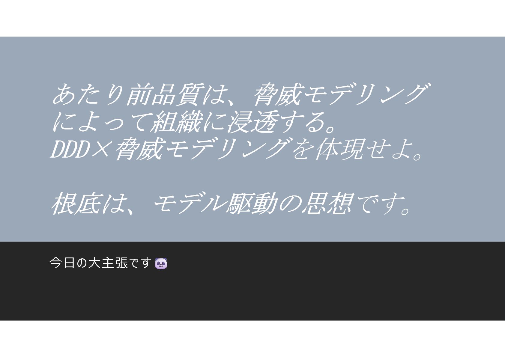 あたり前品質は、脅威モデリング によって組織に浸透する。 DDD×脅威モデリングを体現せよ。 根底は、モデル駆動の思想です。 今日の大主張です
