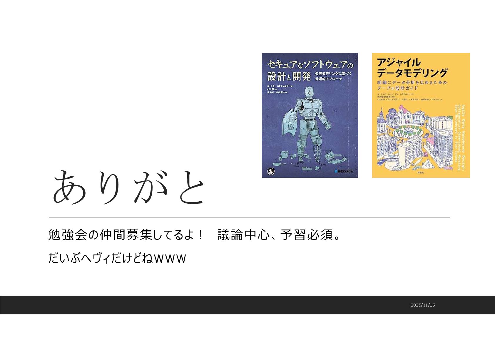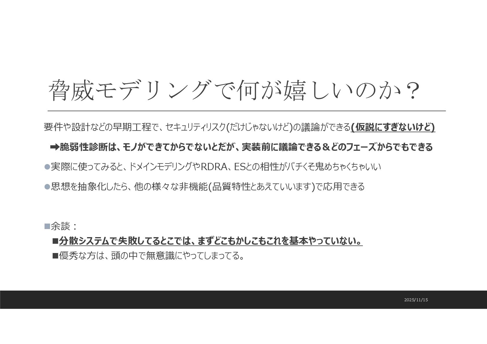 脅威モデリングで何が嬉しいのか? 要件や設計などの早期工程で、セキュリティリスク(だけじゃないけど)の議論ができる(仮説にすぎないけど) 脆弱性診断は、モノができてからでないとだが、実装前に議論できる&どのフェーズからでもできる 実際に使ってみると、ドメインモデリングやRDRA、ESとの相性がバチくそ⿁めちゃくちゃいい 思想を抽象化したら、他の様々な非機能(品質特性とあえていいます)で応用できる 余談: 分散システムで失敗してるとこでは、まずどこもかしこもこれを基本やっていない。 優秀な方は、頭の中で無意識にやってしまってる。 2025/11/15
