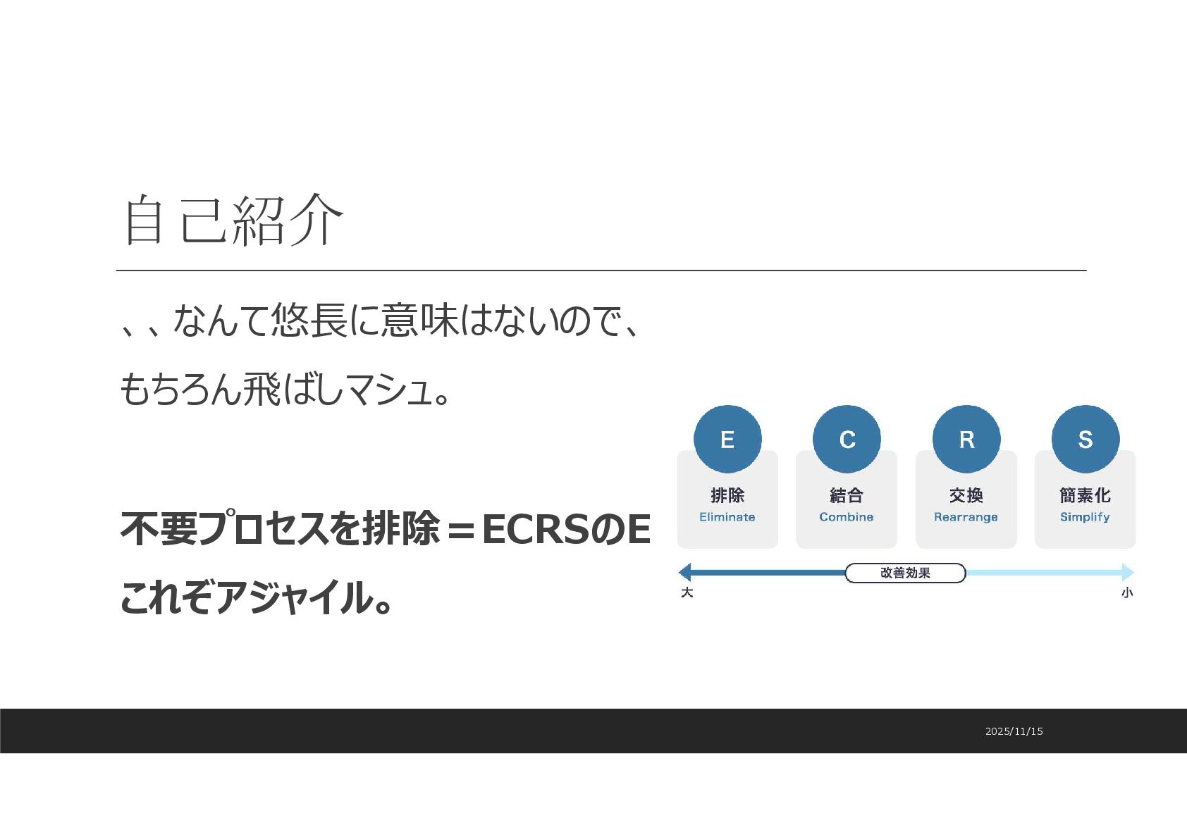 自己紹介 、、なんて悠⾧に意味はないので、 もちろん飛ばしマシュ。 不要プロセスを排除=ECRSのE これぞアジャイル。 2025/11/15