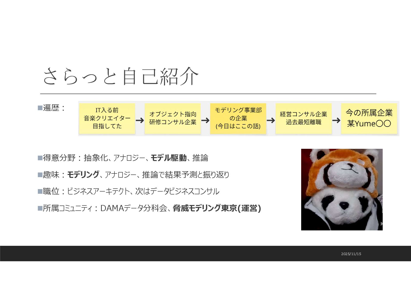 さらっと自己紹介 遍歴: 得意分野:抽象化、アナロジー、モデル駆動、推論 趣味:モデリング、アナロジー、推論で結果予測と振り返り 職位:ビジネスアーキテクト、次はデータビジネスコンサル 所属コミュニティ:DAMAデータ分科会、脅威モデリング東京(運営) 2025/11/15