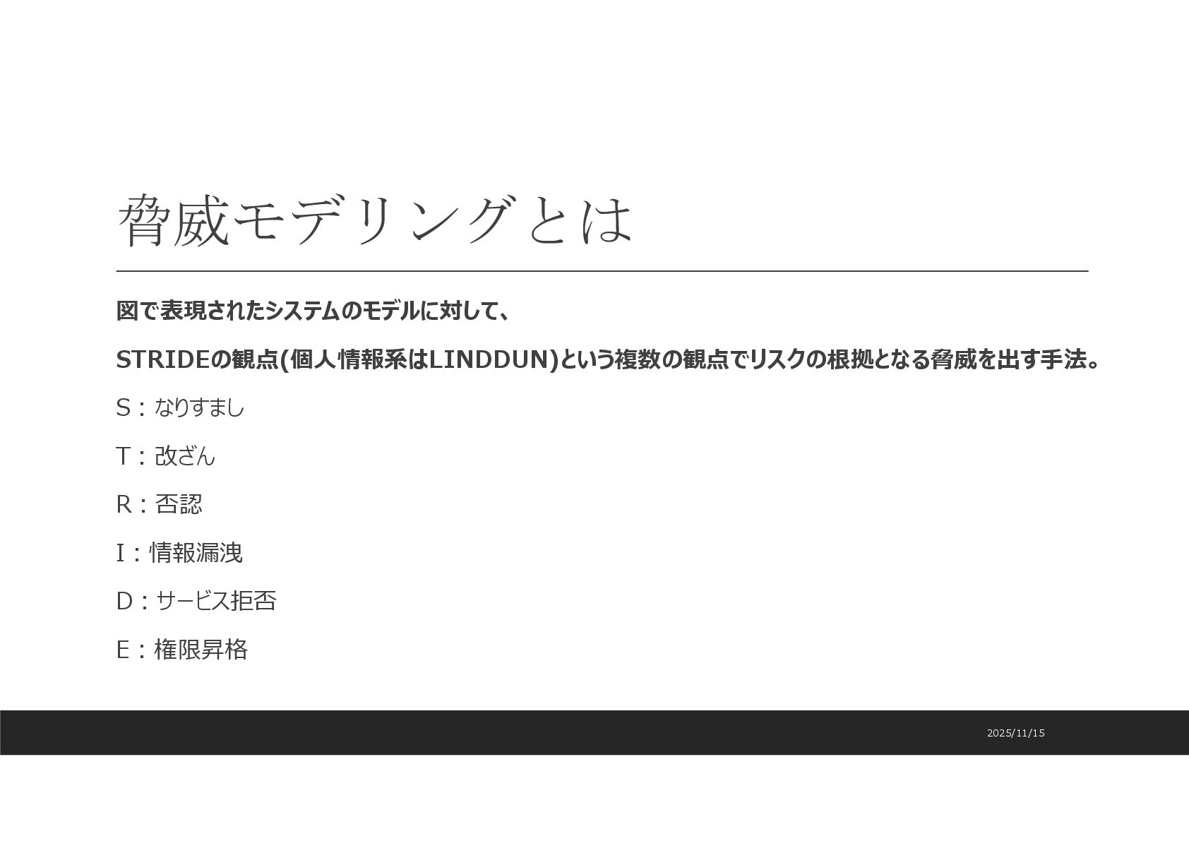 脅威モデリングとは 図で表現されたシステムのモデルに対して、 STRIDEの観点(個人情報系はLINDDUN)という複数の観点でリスクの根拠となる脅威を出す手法。 S:なりすまし T:改ざん R:否認 I:情報漏洩 D:サービス拒否 E:権限昇格 2025/11/15