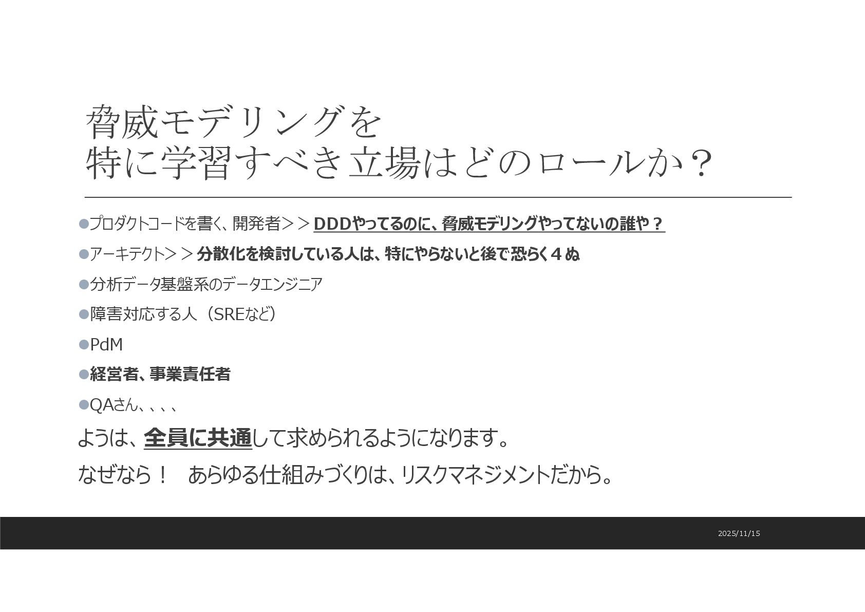 脅威モデリングを 特に学習すべき立場はどのロールか? プロダクトコードを書く、開発者>>DDDやってるのに、脅威モデリングやってないの誰や? アーキテクト>>分散化を検討している人は、特にやらないと後で恐らく4ぬ 分析データ基盤系のデータエンジニア 障害対応する人(SREなど) PdM 経営者、事業責任者 QAさん、、、、 ようは、全員に共通して求められるようになります。