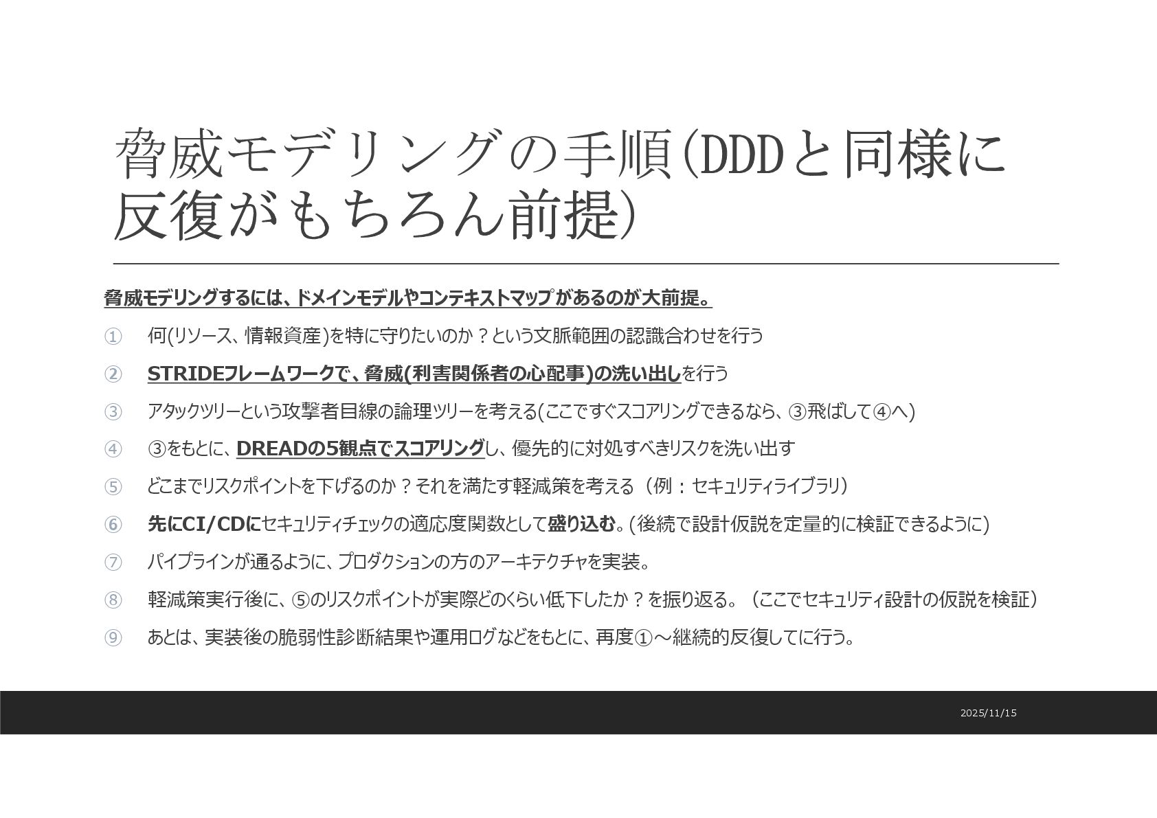 ③をもとに、DREADの5観点でスコアリングし、優先的に対処すべきリスクを洗い出す ⑤ どこまでリスクポイントを下げるのか?それを満たす軽減策を考える(例:セキュリティライブラリ) ⑥ 先にCI/CDにセキュリティチェックの適応度関数として盛り込む。(後続で設計仮説を定量的に検証できるように) ⑦ パイプラインが通るように、プロダクションの方のアーキテクチャを実装。 ⑧ 軽減策実行後に、⑤のリスクポイントが実際どのくらい低下したか?を振り返る。(ここでセキュリティ設計の仮説を検証) ⑨ あとは、実装後の脆弱性診断結果や運用ログなどをもとに、再度①~継続的反復してに行う。 2025/11/15