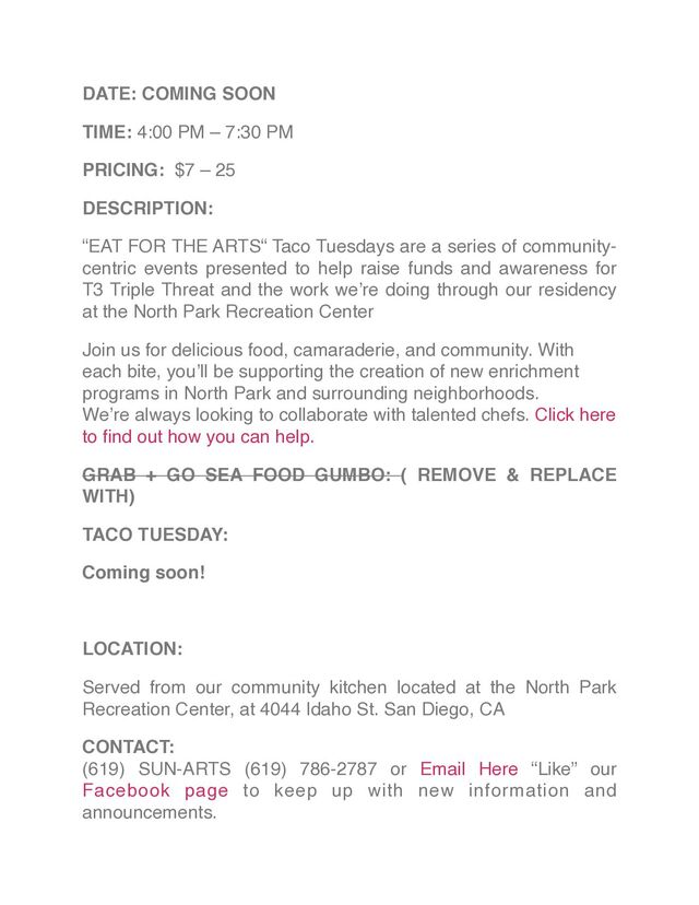 T3 Triple Threat (T3) partners with The City of San Diego Parks and Recreation to provide a premium facility for training in creative and performing arts, with acting, voice, dance, and culinary education. Historically T3 has worked to remove barriers to arts education and mentoring opportunities to youth in marginalized communities. Our mission is to nurture and develop talent in a multidisciplinary community of artists while bringing beauty and diversity to our community as a whole through arts, education, and social responsibility.