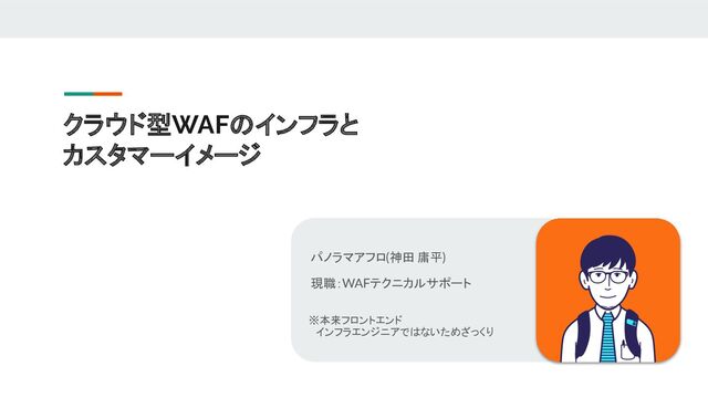 クラウド型WAFのインフラと カスタマーイメージ ※本来フロントエンド インフラエンジニアではないためざっくり パノラマアフロ(神田 庸平) 現職:WAFテクニカルサポート