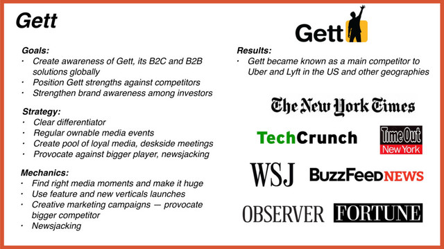 to Uber and Lyft in the US and other geographies Goals: • Create awareness of Gett, its B2C and B2B solutions globally • Position Gett strengths against competitors • Strengthen brand awareness among investors Strategy: • Clear differentiator • Regular ownable media events • Create pool of loyal media, deskside meetings • Provocate against bigger player, newsjacking Mechanics: • Find right media moments and make it huge • Use feature and new verticals launches • Creative marketing campaigns — provocate bigger competitor • Newsjacking