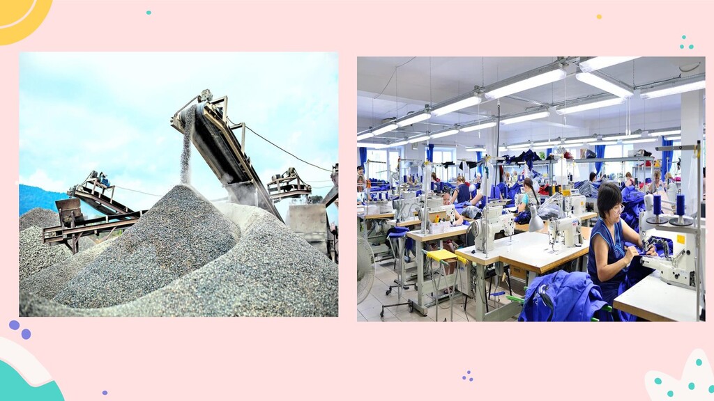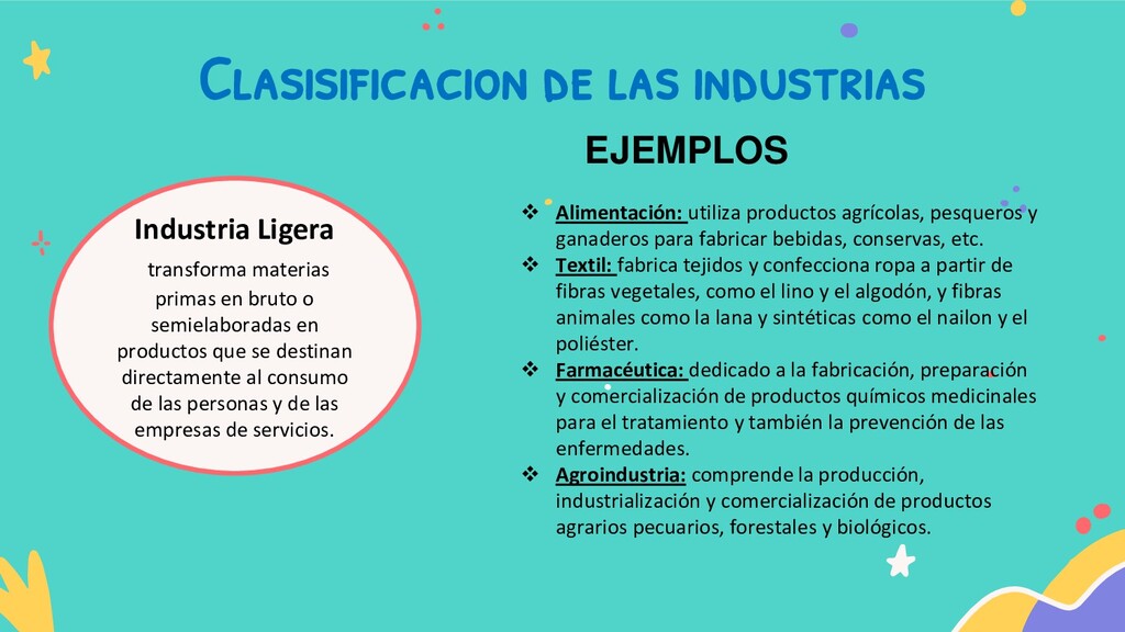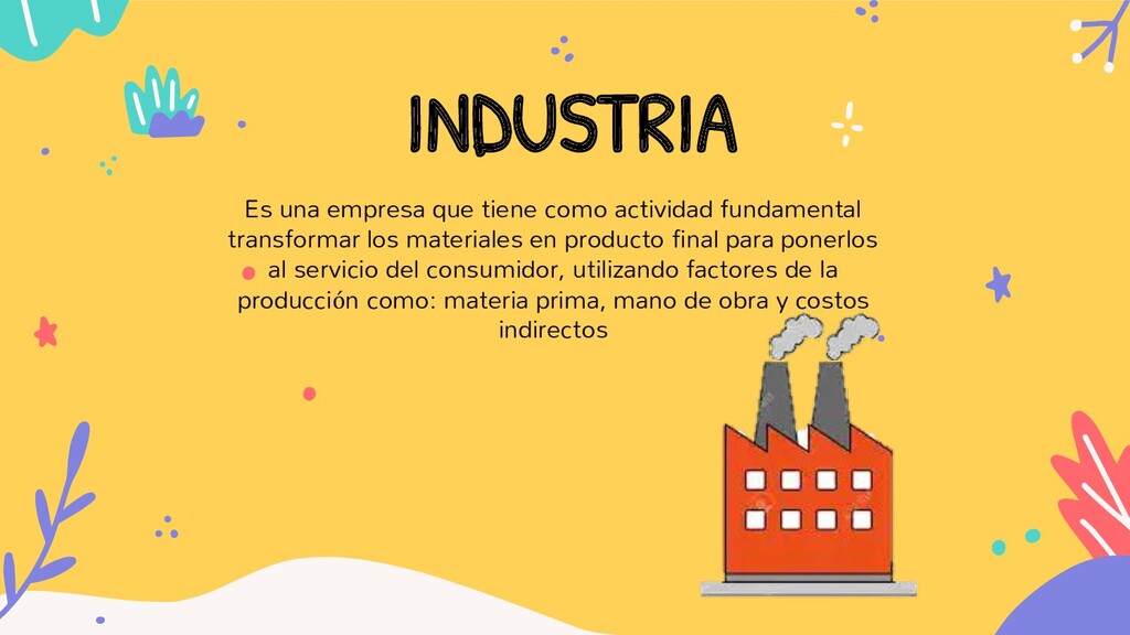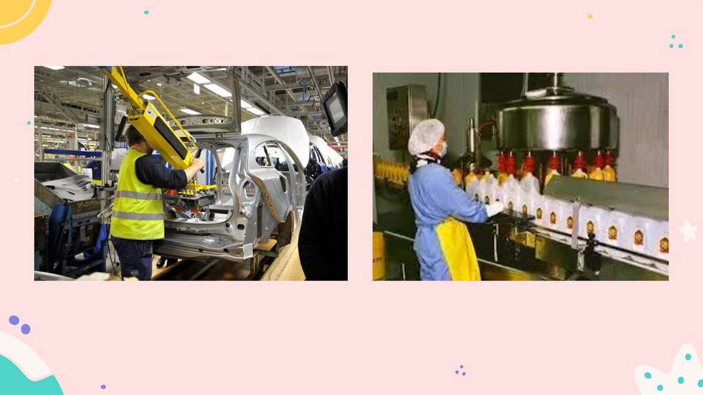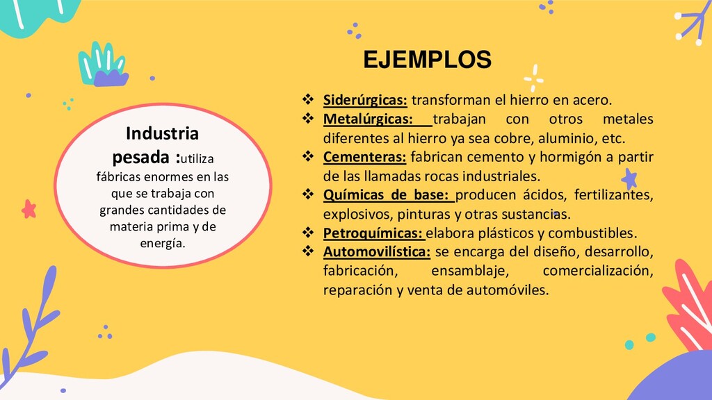 con grandes cantidades de materia prima y de energía. ❖ Siderúrgicas: transforman el hierro en acero. ❖ Metalúrgicas: trabajan con otros metales diferentes al hierro ya sea cobre, aluminio, etc. ❖ Cementeras: fabrican cemento y hormigón a partir de las llamadas rocas industriales. ❖ Químicas de base: producen ácidos, fertilizantes, explosivos, pinturas y otras sustancias. ❖ Petroquímicas: elabora plásticos y combustibles. ❖ Automovilística: se encarga del diseño, desarrollo, fabricación, ensamblaje, comercialización, reparación y venta de automóviles. EJEMPLOS