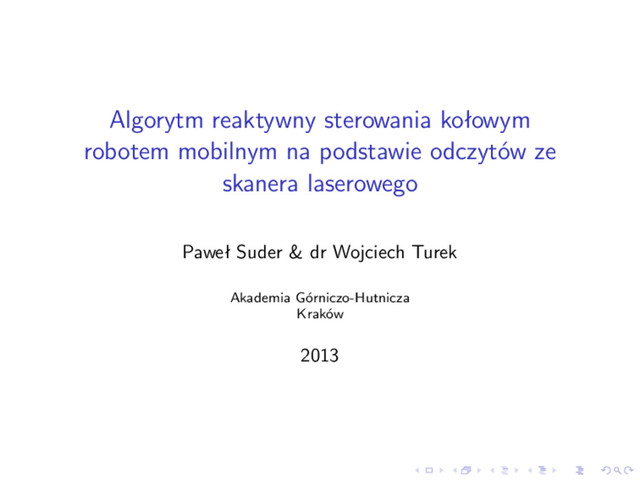 środowisku ruchomych elementów brak możliwości predykcji ruchu innych elementów brak możliwości planowania własnej trasy brak możliwości komunikacji z innymi ruchomymi elementami Dostępne dane odległości względne robota od innych ruchomych elementów, w oparciu o dalmierz przebyta trasa, w oparciu o enkodery na kołach położenie robota, w oparciu o lokalizator Rozwiązanie stosowanie mechanizmów, które będą pozwalały na reakcję w czasie rzeczywistym stosowanie prostych reguł wykorzystywanie informacji z czujników