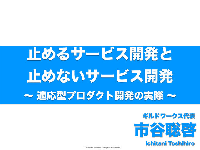 5PTIJIJSP*DIJUBOJ"MM3JHIUT3FTFSWFE ࢭΊΔαʔϏε։ൃͱ ࢭΊͳ͍αʔϏε։ൃ ʙదԠܕϓϩμΫτ։ൃͷ࣮ࡍʙ *DIJUBOJ5PTIJIJSP ࢢ୩૱ܒ ΪϧυϫʔΫεද