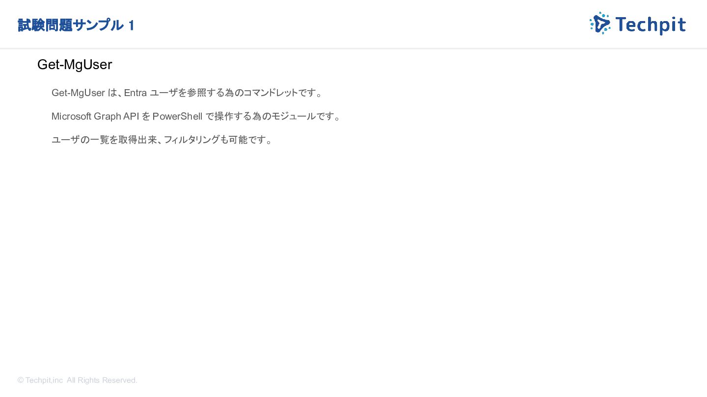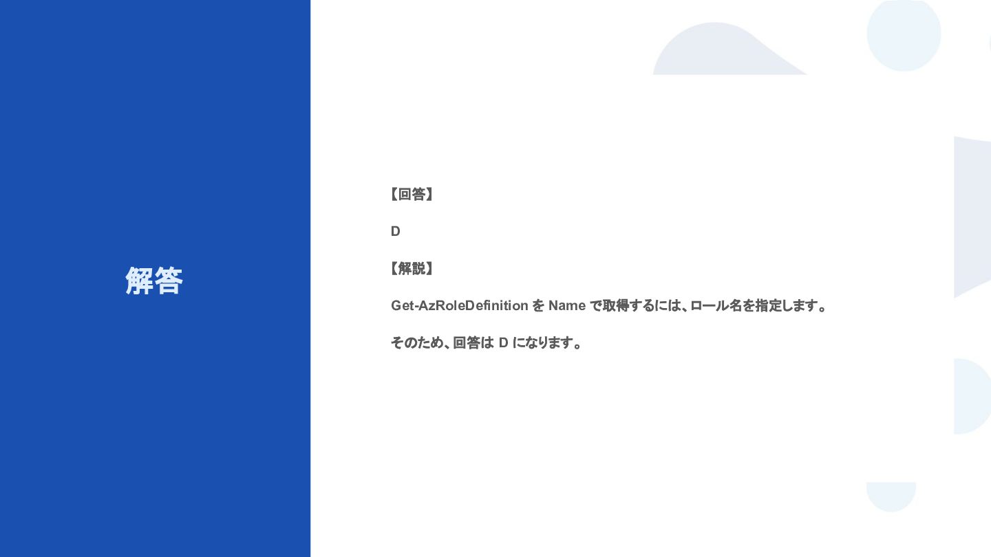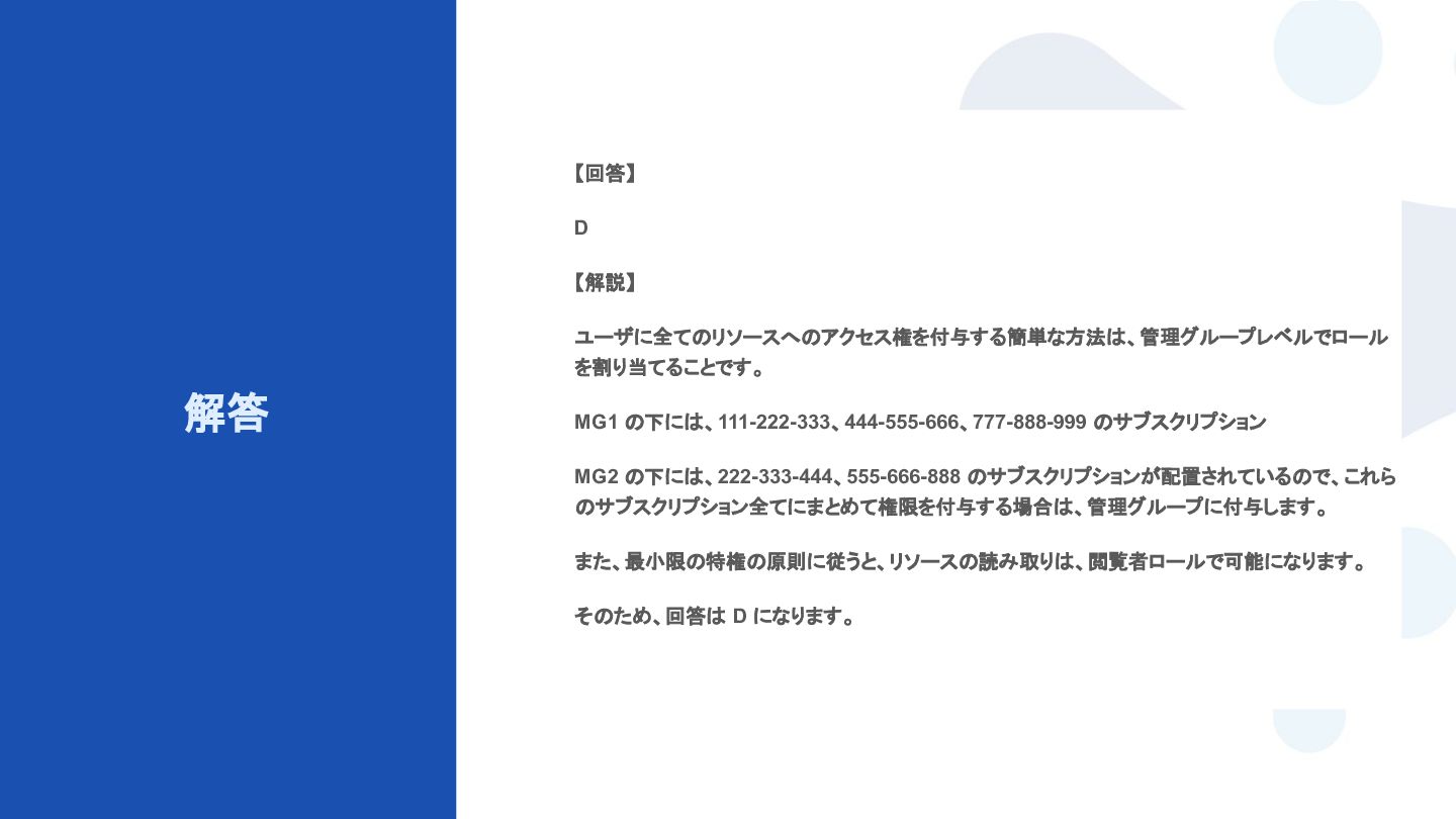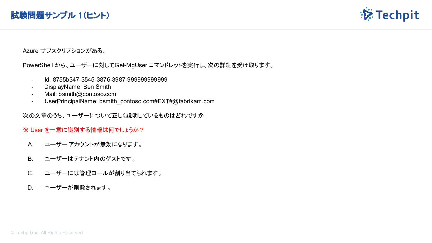 から、ユーザーに対して Get-MgUser コマンドレットを実行し、次の詳細を受け取ります。 - Id: 8755b347-3545-3876-3987-999999999999 - DisplayName: Ben Smith - Mail: [email protected] - UserPrincipalName: bsmith_contoso.com#EXT#@fabrikam.com 次の文章のうち、ユーザーについて正しく説明しているものはどれですか ? ※ User を一意に識別する情報は何でしょうか? A. ユーザー アカウントが無効になります。 B. ユーザーはテナント内のゲストです。 C. ユーザーには管理ロールが割り当てられます。 D. ユーザーが削除されます。