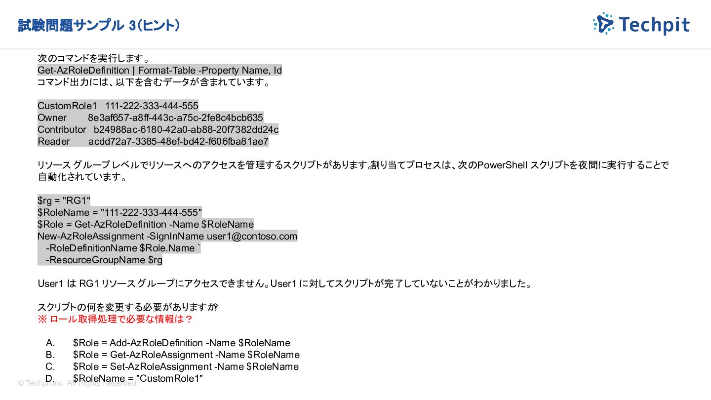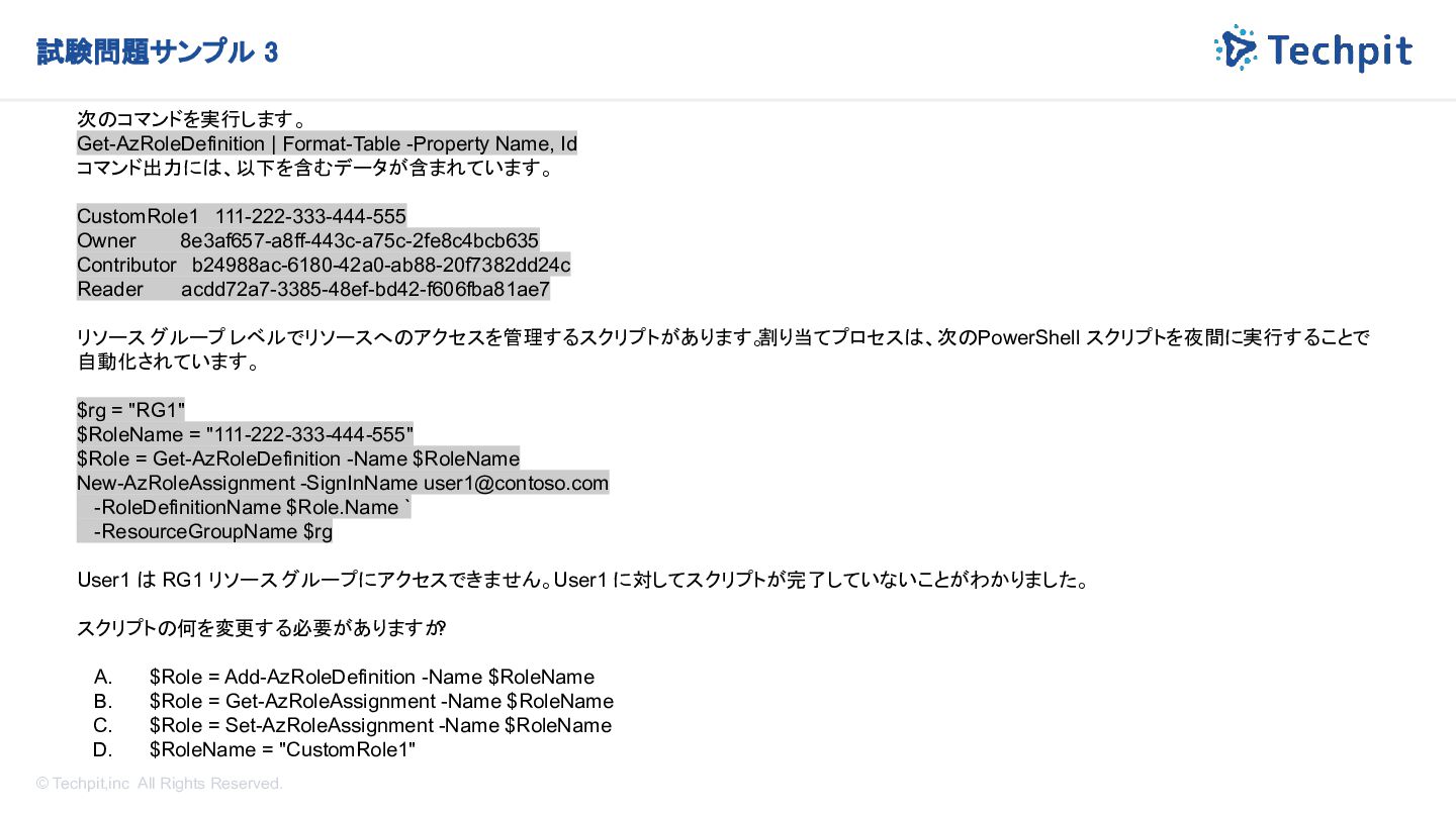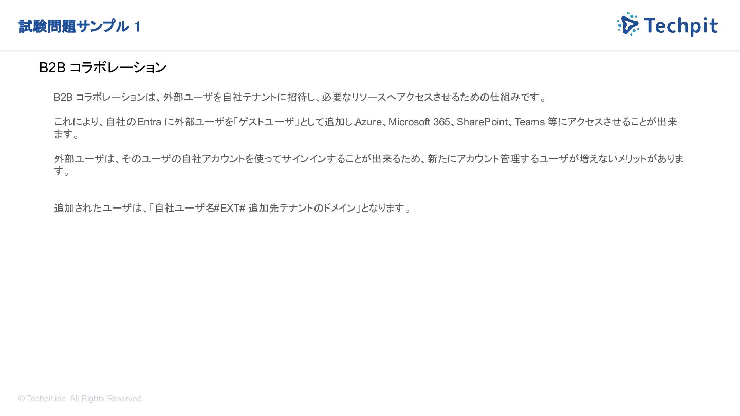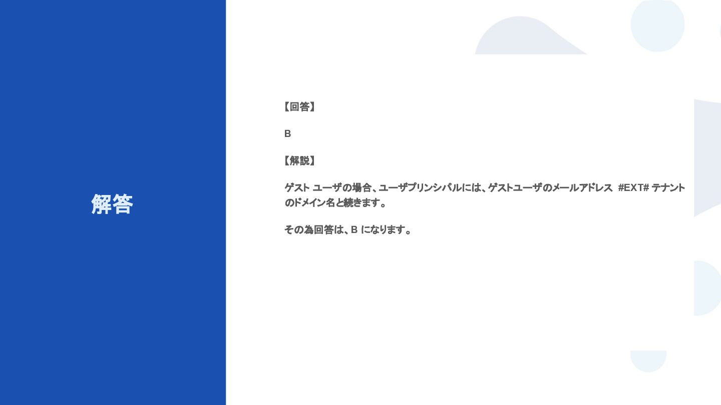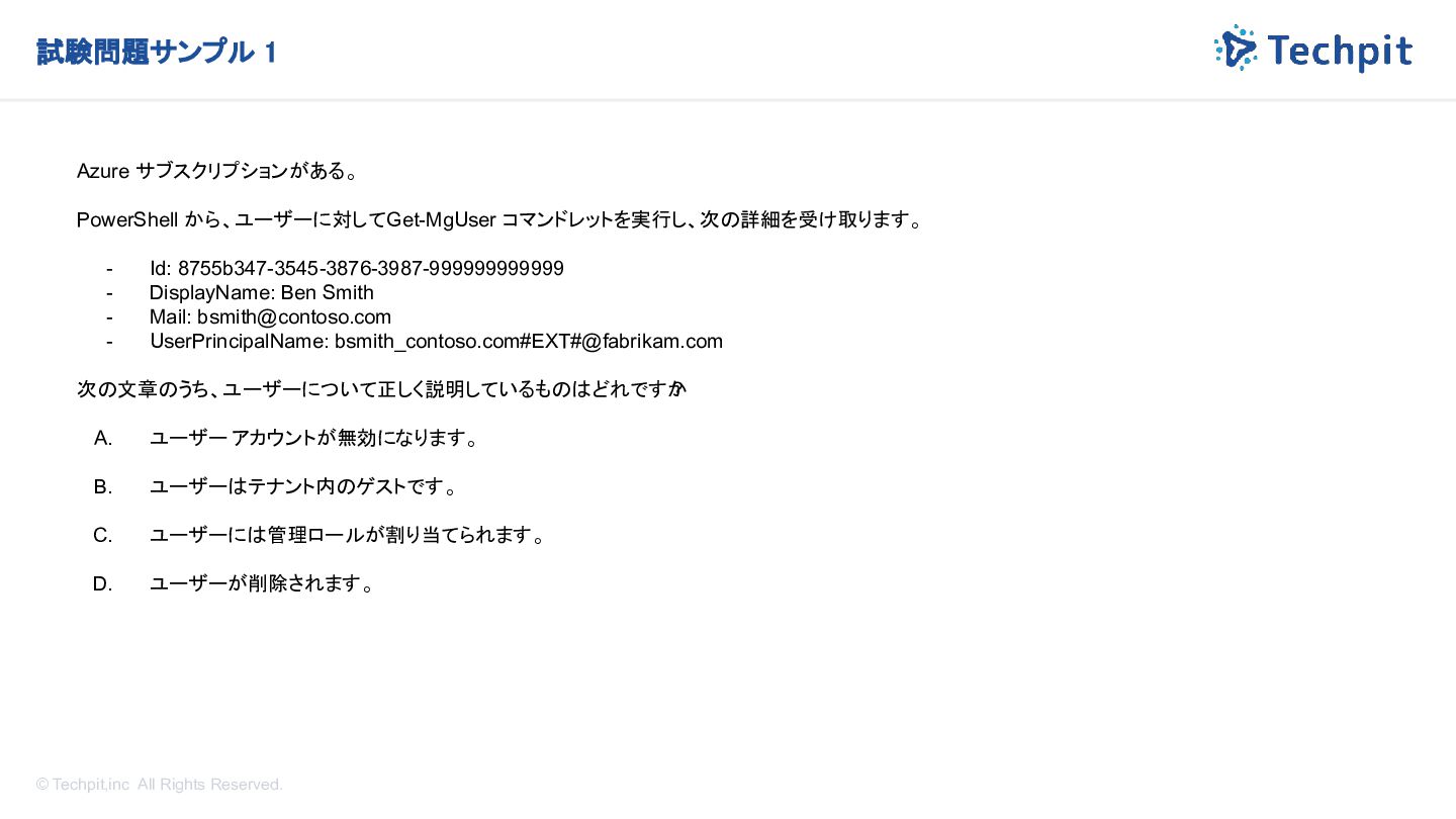 から、ユーザーに対して Get-MgUser コマンドレットを実行し、次の詳細を受け取ります。 - Id: 8755b347-3545-3876-3987-999999999999 - DisplayName: Ben Smith - Mail: [email protected] - UserPrincipalName: bsmith_contoso.com#EXT#@fabrikam.com 次の文章のうち、ユーザーについて正しく説明しているものはどれですか ? A. ユーザー アカウントが無効になります。 B. ユーザーはテナント内のゲストです。 C. ユーザーには管理ロールが割り当てられます。 D. ユーザーが削除されます。