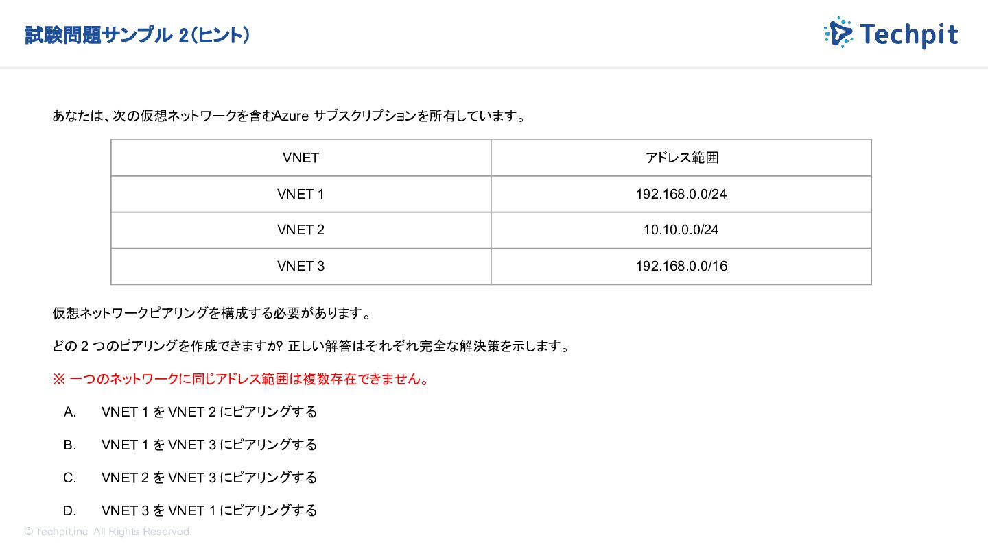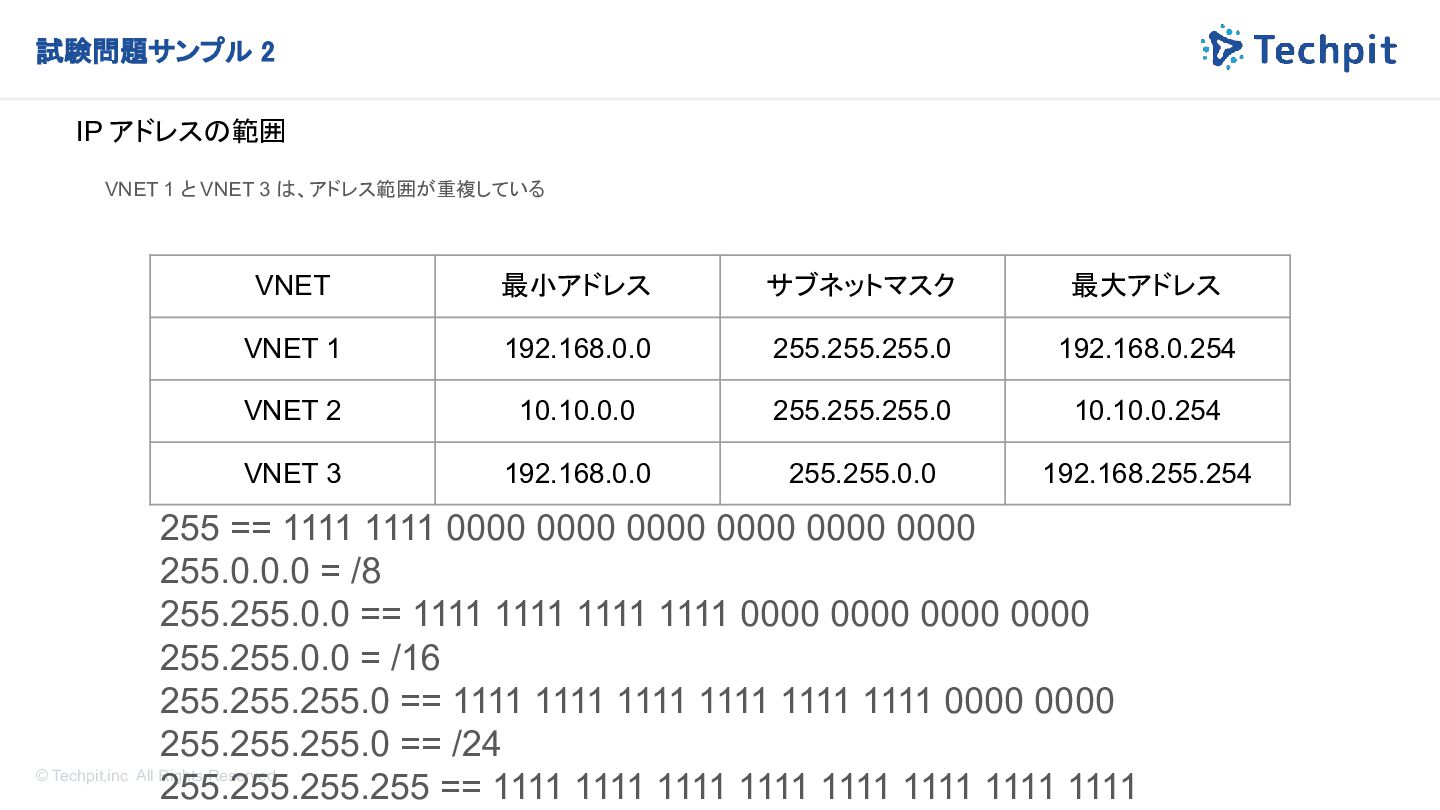 11. © Techpit,inc All Rights Reserved. 試験問題サンプル 2 IP アドレスの範囲 VNET
