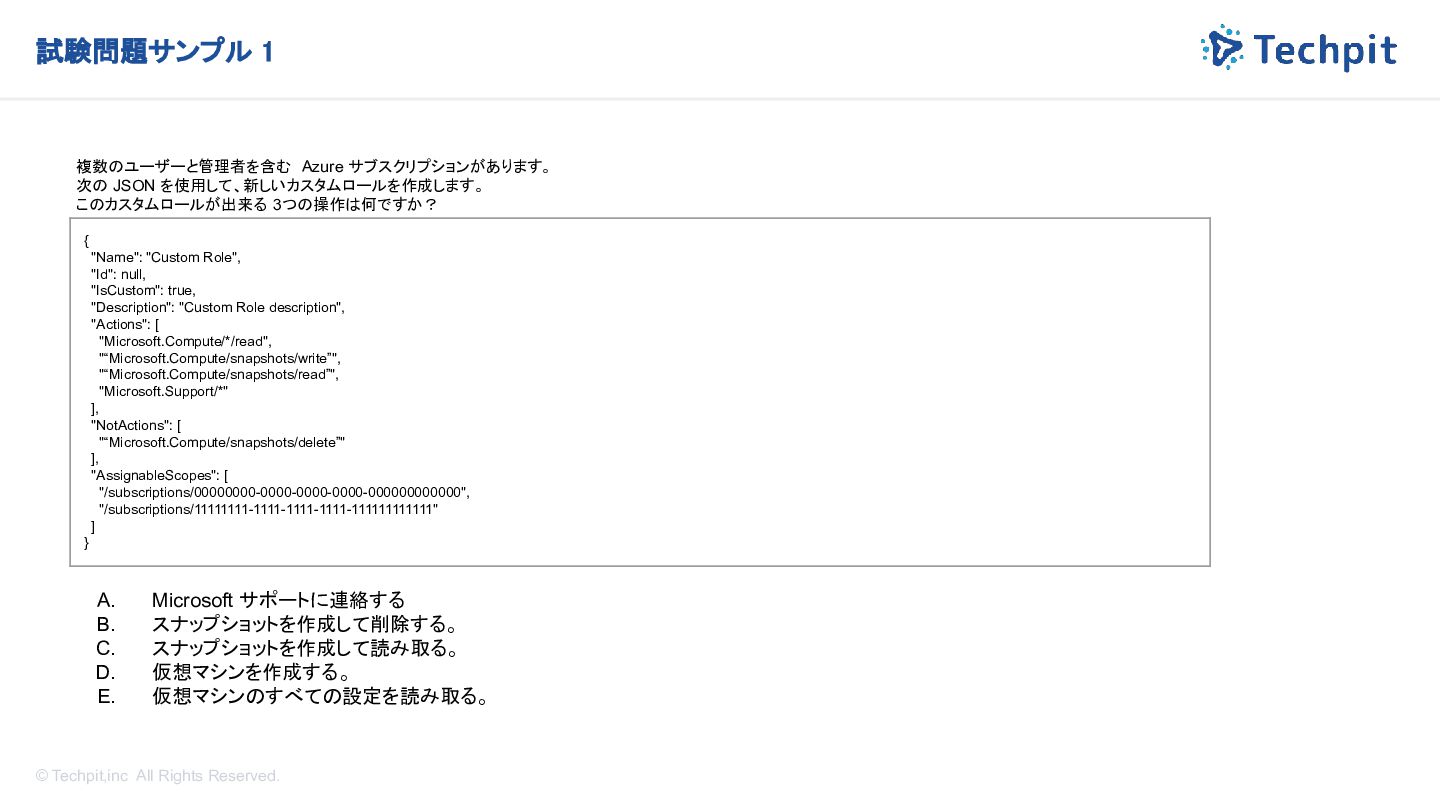 次の JSON を使用して、新しいカスタムロールを作成します。 このカスタムロールが出来る 3つの操作は何ですか? ※ Action の項目に注目 { "Name": "Custom Role", "Id": null, "IsCustom": true, "Description": "Custom Role description", "Actions": [ "Microsoft.Compute/*/read", "“Microsoft.Compute/snapshots/write”", "“Microsoft.Compute/snapshots/read”", "Microsoft.Support/*" ], "NotActions": [ "“Microsoft.Compute/snapshots/delete”" ], "AssignableScopes": [ "/subscriptions/00000000-0000-0000-0000-000000000000", "/subscriptions/11111111-1111-1111-1111-111111111111" ] } A. Microsoft サポートに連絡する B. スナップショットを作成して削除する。 C. スナップショットを作成して読み取る。 D. 仮想マシンを作成する。 E. 仮想マシンのすべての設定を読み取る。