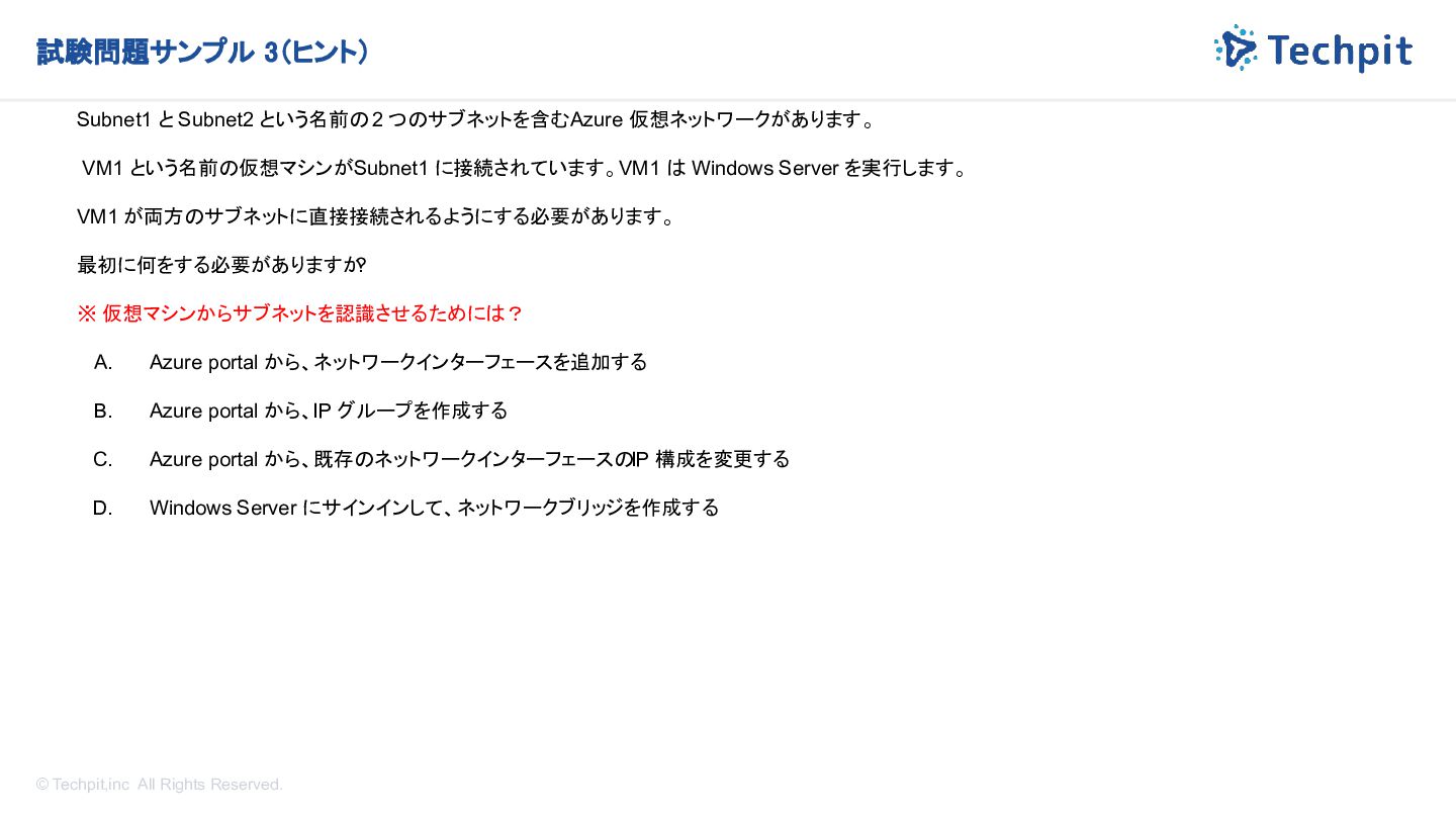 16. © Techpit,inc All Rights Reserved. 試験問題サンプル 3 仮想マシンとサブネット VM をサブネットに接続する為には、