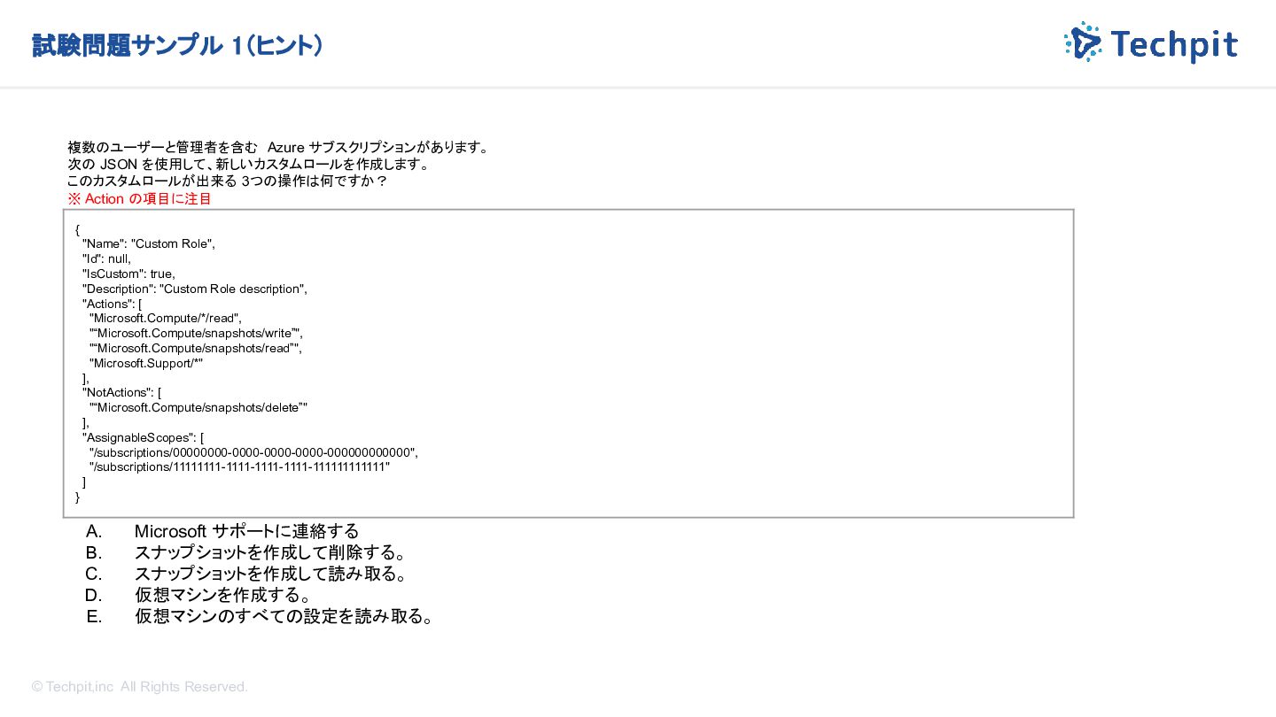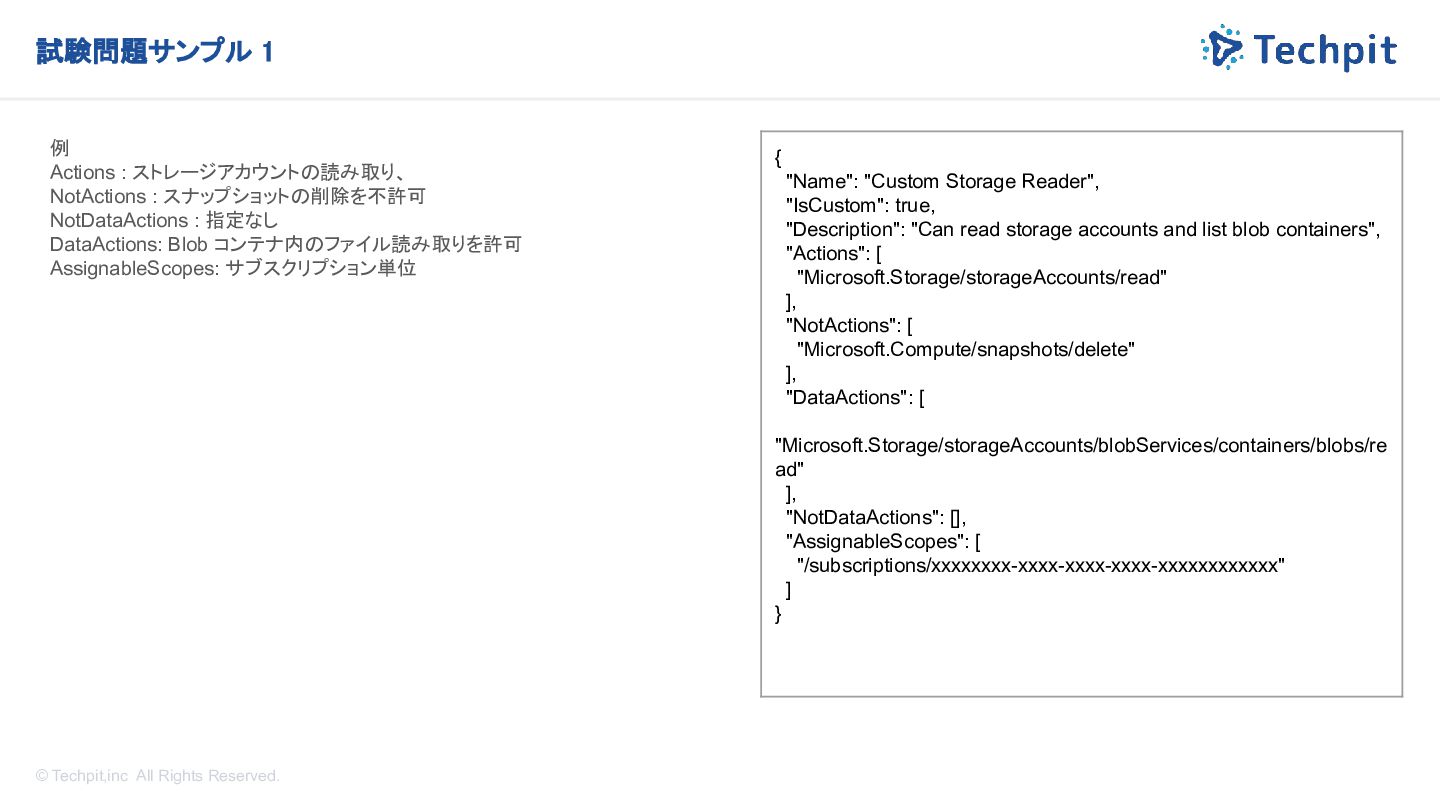 4. © Techpit,inc All Rights Reserved. 試験問題サンプル 1 カスタムロール カスタムロールは、Azure のリソースに対して細かくアクセス制御を設定する為の仕組みです。