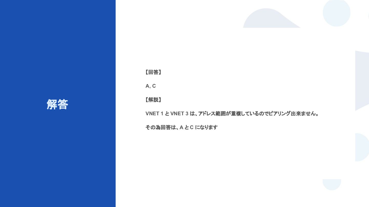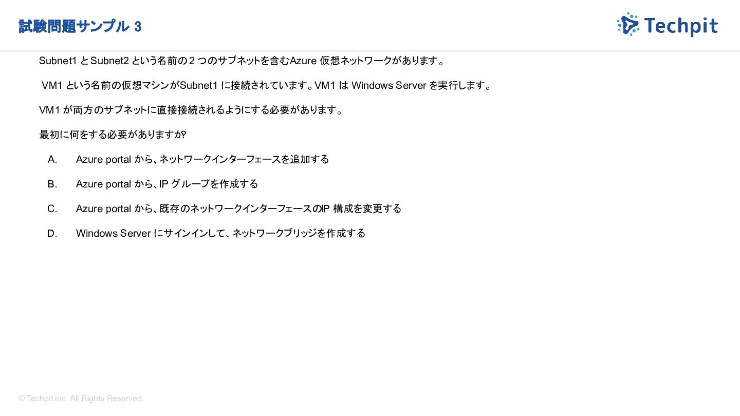 という名前の 2 つのサブネットを含む Azure 仮想ネットワークがあります。 VM1 という名前の仮想マシンが Subnet1 に接続されています。 VM1 は Windows Server を実行します。 VM1 が両方のサブネットに直接接続されるようにする必要があります。 最初に何をする必要がありますか ? ※ 仮想マシンからサブネットを認識させるためには? A. Azure portal から、ネットワークインターフェースを追加する B. Azure portal から、IP グループを作成する C. Azure portal から、既存のネットワークインターフェースの IP 構成を変更する D. Windows Server にサインインして、ネットワークブリッジを作成する