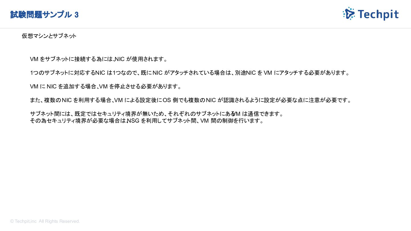 NIC が使用されます。 1つのサブネットに対応する NIC は1つなので、既に NIC がアタッチされている場合は、別途 NIC を VM にアタッチする必要があります。 VM に NIC を追加する場合、VM を停止させる必要があります。 また、複数の NIC を利用する場合、VM による設定後に OS 側でも複数の NIC が認識されるように設定が必要な点に注意が必要です。 サブネット間には、既定ではセキュリティ境界が無いため、それぞれのサブネットにある VM は通信できます。 その為セキュリティ境界が必要な場合は、 NSG を利用してサブネット間、 VM 間の制御を行います。