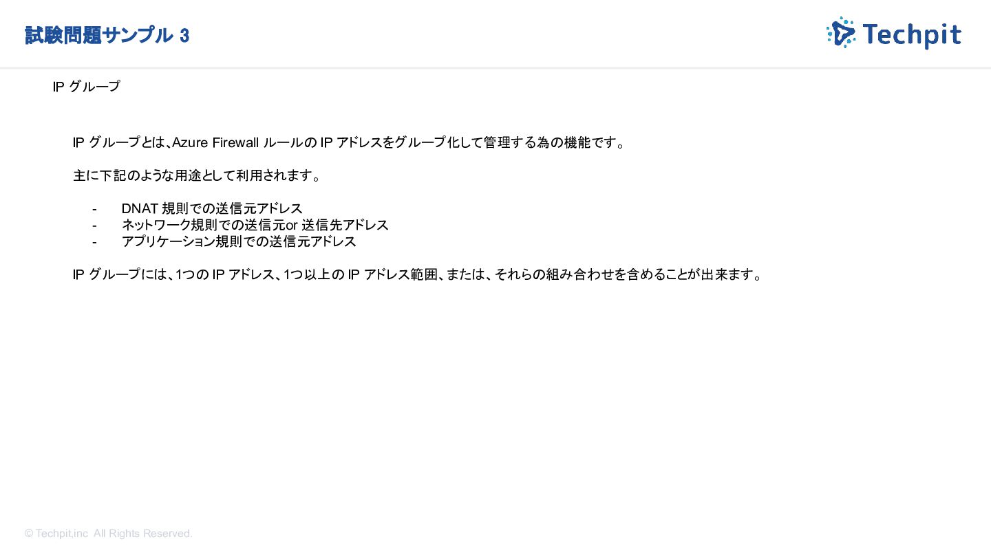 グループとは、Azure Firewall ルールの IP アドレスをグループ化して管理する為の機能です。 主に下記のような用途として利用されます。 - DNAT 規則での送信元アドレス - ネットワーク規則での送信元 or 送信先アドレス - アプリケーション規則での送信元アドレス IP グループには、1つの IP アドレス、1つ以上の IP アドレス範囲、または、それらの組み合わせを含めることが出来ます。