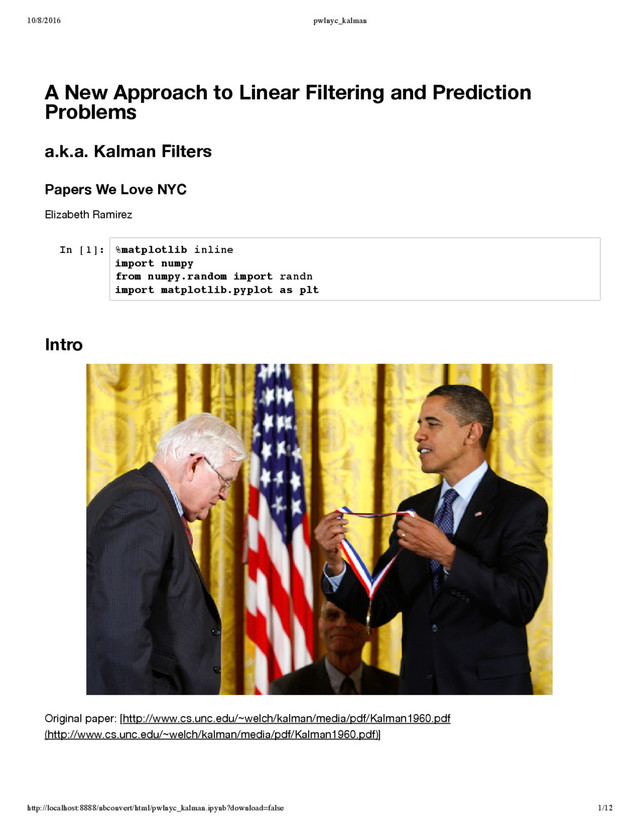 Rudolf Kálmán recently passed away, and I thought it was a good idea to honor his memory at Papers We Love by presenting his original paper published in 1960, "A New Approach to Linear Filtering and Prediction Problems", aka Kalman Filter.
