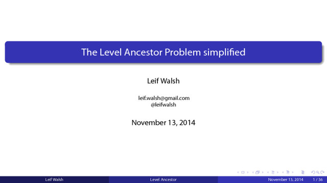 Leif Walsh , engineer at Tokutek (and from PWL NYC), comes to visit us! Leif will present the Level Ancestor Simplified paper by Bender and Farach-Colton.