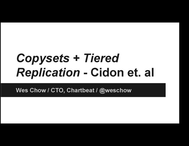 Tiered Replication, by Cidon et. al, explores the problem of effective data replication strategies first introduced in the Copysets paper, awarded 2013 Usenix ATC Best Student Paper. While Copysets introduced a randomized algorithm for solving NP Hard redundancy and load balancing constraints around placement of data in distributed filesystem, Tiered Replication proposes a greedy algorithm for solving the same problem and also adding the ability to bake in real world constraints such as rack awareness. Wes will summarize the problem Copysets proposed, show Tiered Replication’s solution, and examine a real world deployment of the algorithm at Chartbeat.