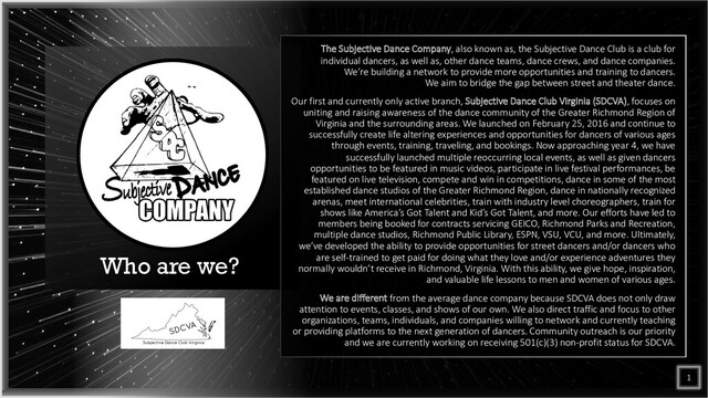 The Subjective Dance Company, also known as, the Subjective Dance Club is a club for individual dancers, as well as, other dance teams, dance crews, and dance companies. We’re building a network to provide more opportunities and training to dancers. We aim to bridge the gap between street and theater dance. Our first and currently only active branch, Subjective Dance Club Virginia (SDCVA), focuses on uniting and raising awareness of the dance community of the Greater Richmond Region of Virginia and the surrounding areas. We launched on February 25, 2016 and continue to successfully create life altering experiences and opportunities for dancers of various ages through events, training, traveling, and bookings. Now approaching year 4, we have successfully launched multiple reoccurring local events, as well as given dancers opportunities to be featured in music videos, participate in live festival performances, be featured on live television, compete and win in competitions, dance in some of the most established dance studios of the Greater Richmond Region, dance in nationally recognized arenas, meet international celebrities, train with industry level choreographers, train for shows like America’s Got Talent and Kid’s Got Talent, and more. Our efforts have led to members being booked for contracts servicing GEICO, Richmond Parks and Recreation, multiple dance studios, Richmond Public Library, ESPN, VSU, VCU, and more. Ultimately, we’ve developed the ability to provide opportunities for street dancers and/or dancers who are self-trained to get paid for doing what they love and/or experience adventures they normally wouldn’t receive in Richmond, Virginia. With this ability, we give hope, inspiration, and valuable life lessons to men and women of various ages. We are different from the average dance company because SDCVA does not only draw attention to events, classes, and shows of our own. We also direct traffic and focus to other organizations, teams, individuals, and companies willing to network and currently teaching or providing platforms to the next generation of dancers. Community outreach is our priority and we are currently working on receiving 501(c)(3) non-profit status for SDCVA. 1