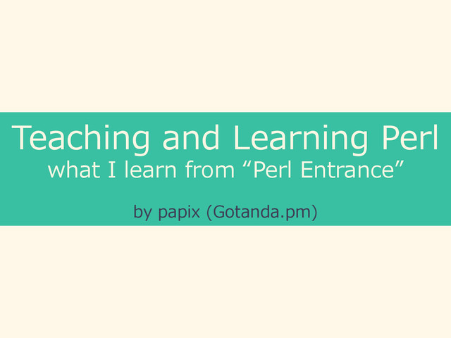 – Covers all the class materials and also more advanced topics • https://github.com/perl-‐‑‒entrance-‐‑‒org/Perl-‐‑‒Entrance-‐‑‒Textbook – Now, you can learn... • Amon2 (WAF) • Homebrew • Vagrant • Ansible • Serverspec • Git • Bitbucket / Github • Object Oriented Programming • Testing Perl • O/R Mapper (Teng) • Continuous Integration • Exception • Validation • React.js