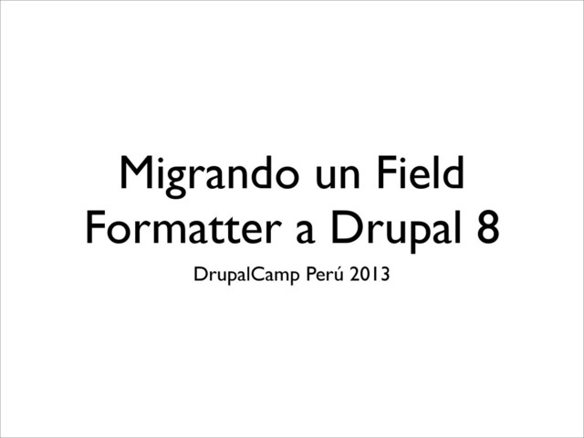 vine.module vine 8.x-1.0 •Archivos •vine.info.yml vineFormatter.php Powered by Drupal ¿Por qué se ha elegido un módulo simple? Para abarcar aspectos puntuales, que son particulares a la funcionalidad de este módulo ¿Qué documentación es necesaria? Al ser simple, es suficiente con estas diapositivas Sin embargo, es recomendable entender los conceptos y las implementaciones Migrando un Módulo Simple a Drupal 8 •Field Formatter •Documentación acerca de Migración •Drupal 8 Plugins