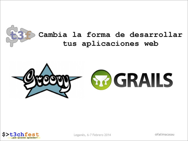 un conjunto de frameworks consolidados Apoyado por una extensa librería de plugins Soluciona todas las necesidades en el desarrollo de aplicaciones web Facilita el desarrollo de dichas aplicaciones Utiliza GROOVY como lenguage @fatimacasau @t3chfest 2014