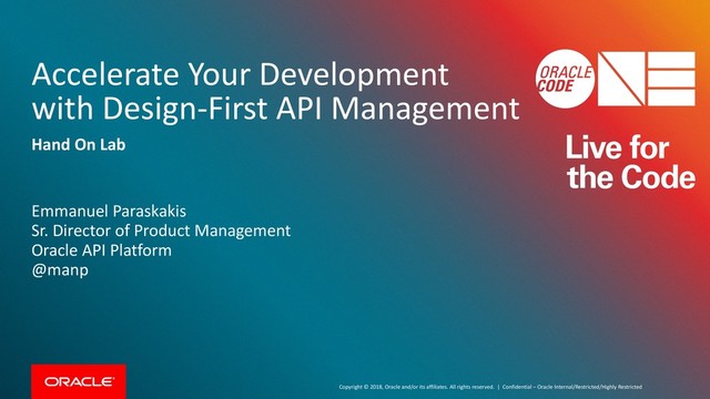 | Confidential – Oracle Internal/Restricted/Highly Restricted Accelerate Your Development with Design-First API Management Hand On Lab Emmanuel Paraskakis Sr. Director of Product Management Oracle API Platform @manp