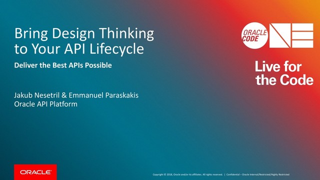 | Confidential – Oracle Internal/Restricted/Highly Restricted Bring Design Thinking to Your API Lifecycle Deliver the Best APIs Possible Jakub Nesetril & Emmanuel Paraskakis Oracle API Platform