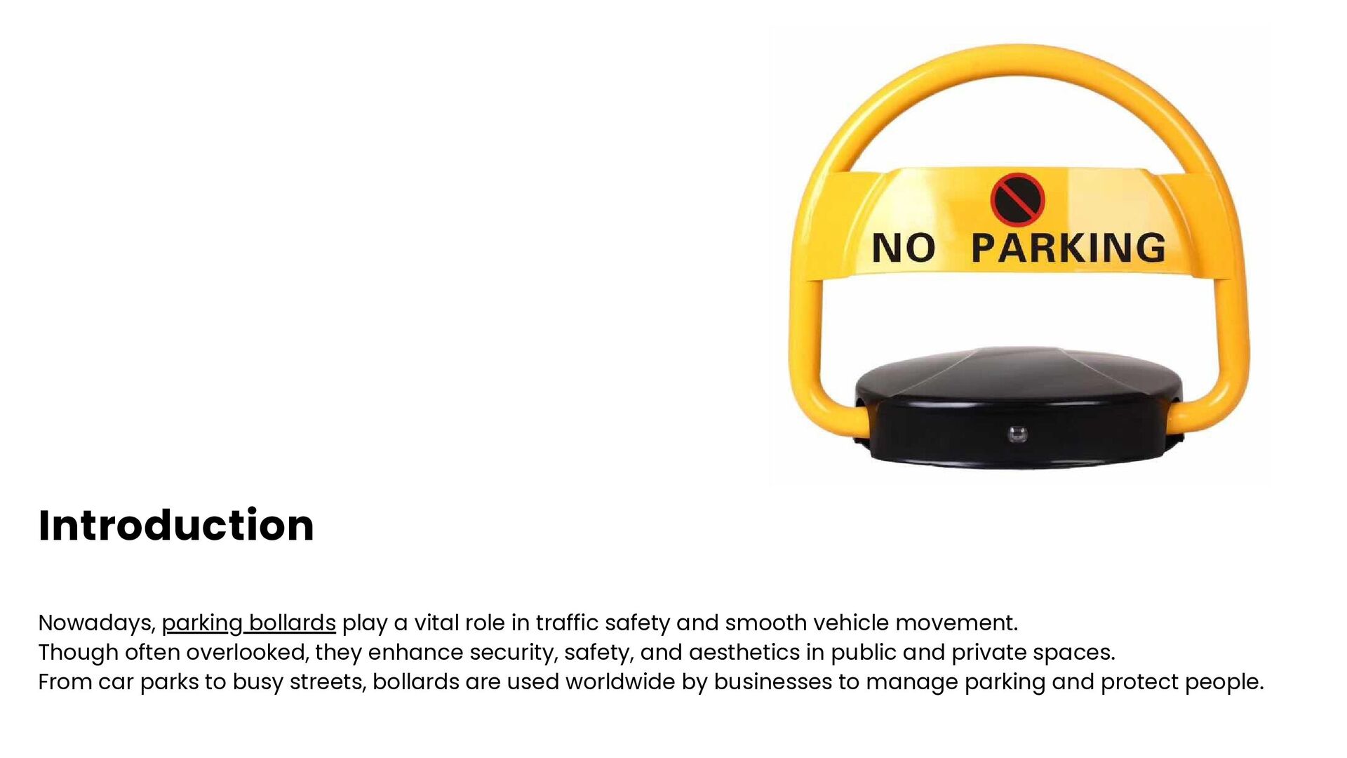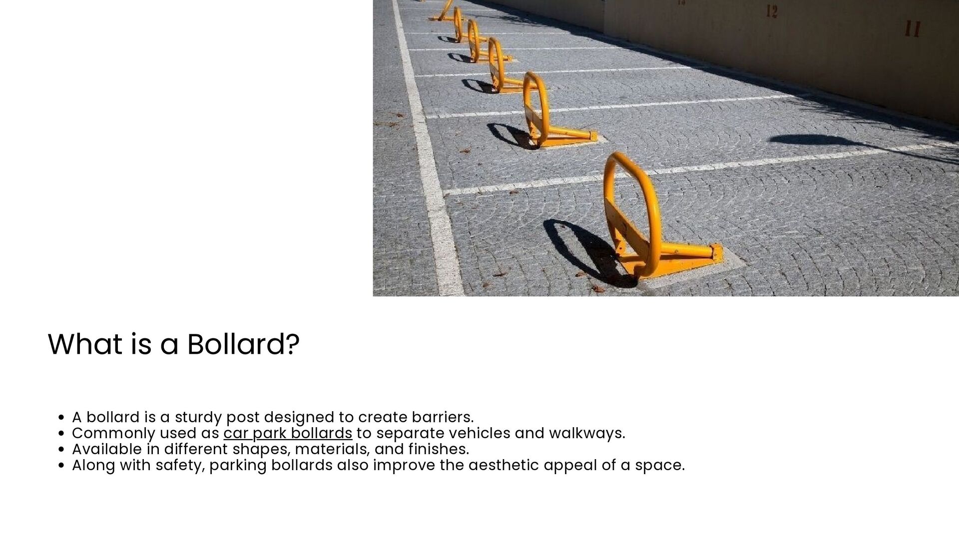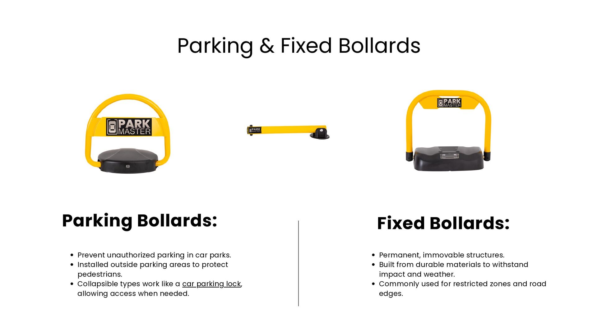 At Park Master, we believe parking bollards are vital tools for safety and order. This presentation covers their types, functions, and global importance. Learn how bollards improve traffic flow, protect pedestrians, and enhance aesthetics while showcasing how Park Master delivers reliable parking and security solutions.