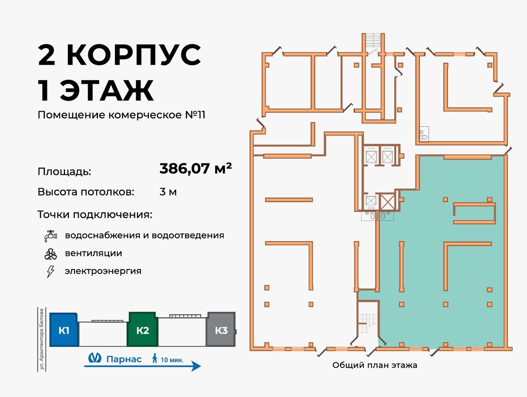 м 386,07 м2 Площадь: Высота потолков: водоснабжения и водоотведения Точки подключения: вентиляции электроэнергия Помещение комерческое №11 2 корпус 1 этаж Общий план этажа