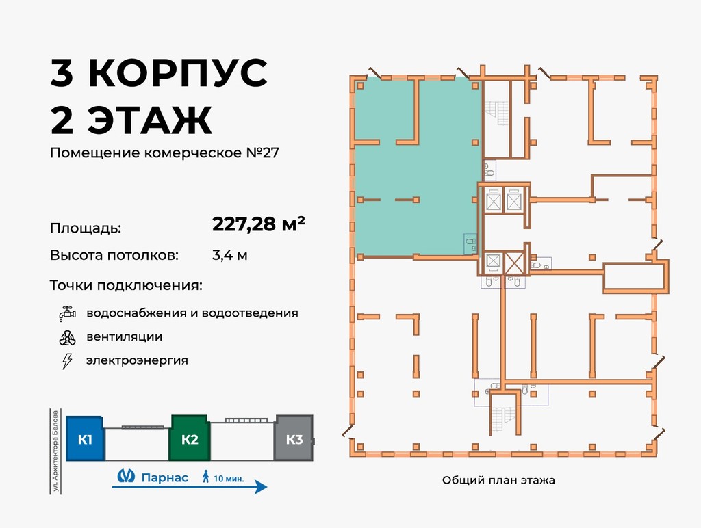 этажа ул. Архитектора Белова Парнас 10 мин. К1 К2 К3 Площадь: Высота потолков: водоснабжения и водоотведения Точки подключения: вентиляции электроэнергия Помещение комерческое №27