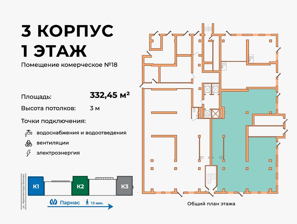 этажа ул. Архитектора Белова Парнас 10 мин. К1 К2 К3 Площадь: Высота потолков: водоснабжения и водоотведения Точки подключения: вентиляции электроэнергия Помещение комерческое №18